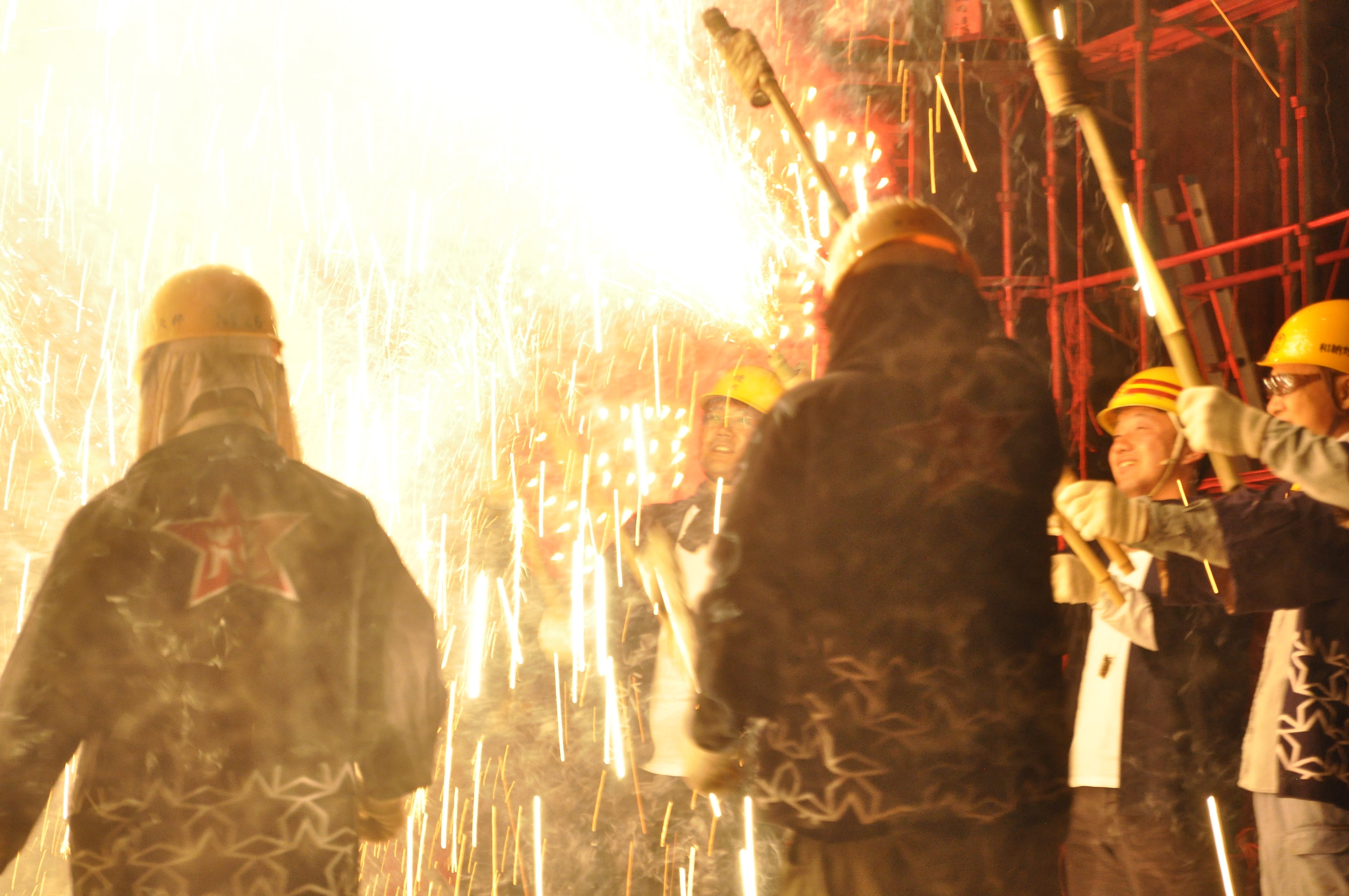この祭りの最高潮で繰り広げられる地元花火方による草花火です。竹筒に火薬を詰め込んだ手持ちの草花火を、花火方が火の粉をかぶりながら次から次へと吹き上がらせます。