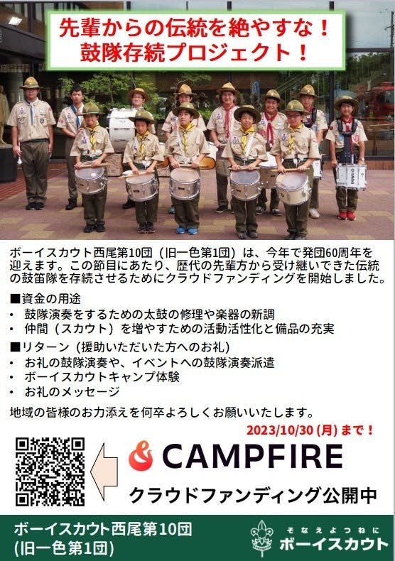 みなさんのご協力により、この鼓隊演奏の継続とたくさんの仲間たちといろんなスカウト活動を行っていきたいです。