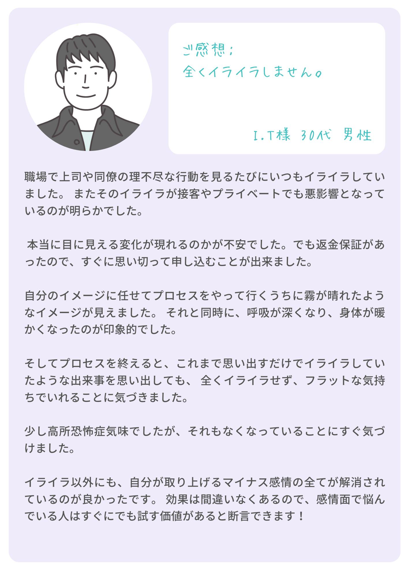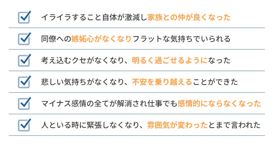言い換えれば、マイナス感情を解消できれば、結果(≒環境)が一変します。例えばビジネスや恋愛、家族・友人との人間関係、趣味や健康、あらゆる側面での改善が見られます。自分を苦しめる感情・記憶から解放され、 モチベーションの向上や良好な人間関係の構築など、さまざまな効果を期待できます。