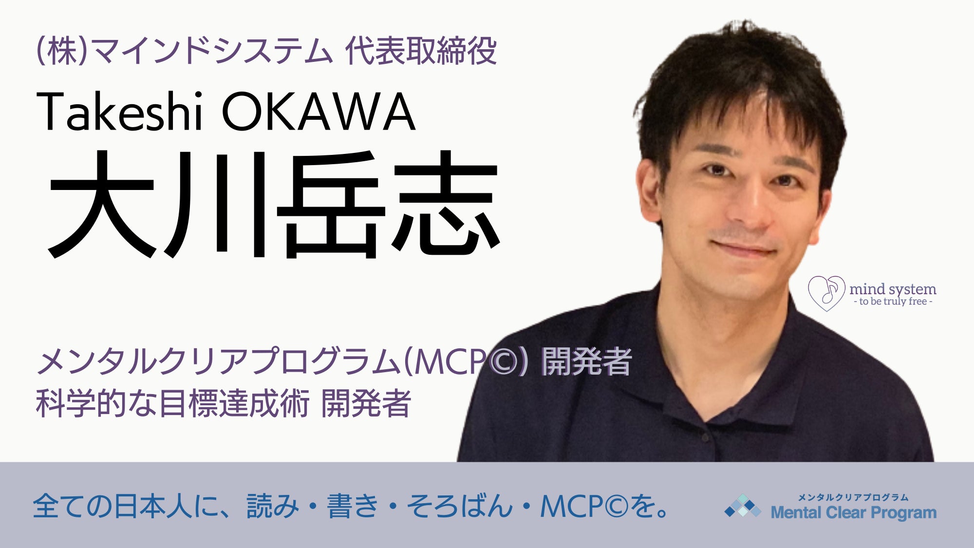 みなさん、はじめまして!株式会社マインドシステム代表取締役の大川岳志(おおかわたけし)と申します。メンタルクリアプログラム(MCP©)開発者であり、科学的な目標達成術の開発者でもあります。