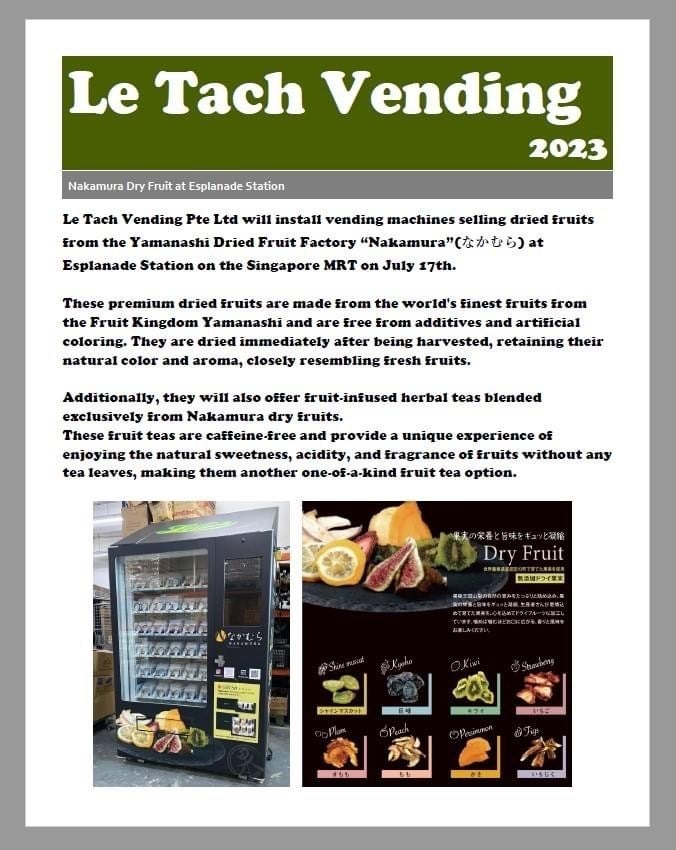 シンガポールの地下鉄MRTのエスプラネイド(Esplanade)駅になかむらのドライフルーツ専用自動販売機が設置され、販売を開始しています。シンガポールでも山梨乾燥果実工房なかむらのドライフルーツが食べられるようになりました。