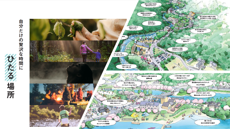 玉川ダム、木地川、蒼社川。この地域は水の恵みにあふれています。そして鈍川温泉。温泉に浸ってゆっくりする。水の恵みを感じる地域の食に浸る、自然の中でのサウナ体験で渓流に浸る。日常を少し忘れて、妄想に浸ることもこの地域だからこそできたりするのではないか。そんな地域住民のこの地域で味わってもらいたい過ごし方が詰まっています。