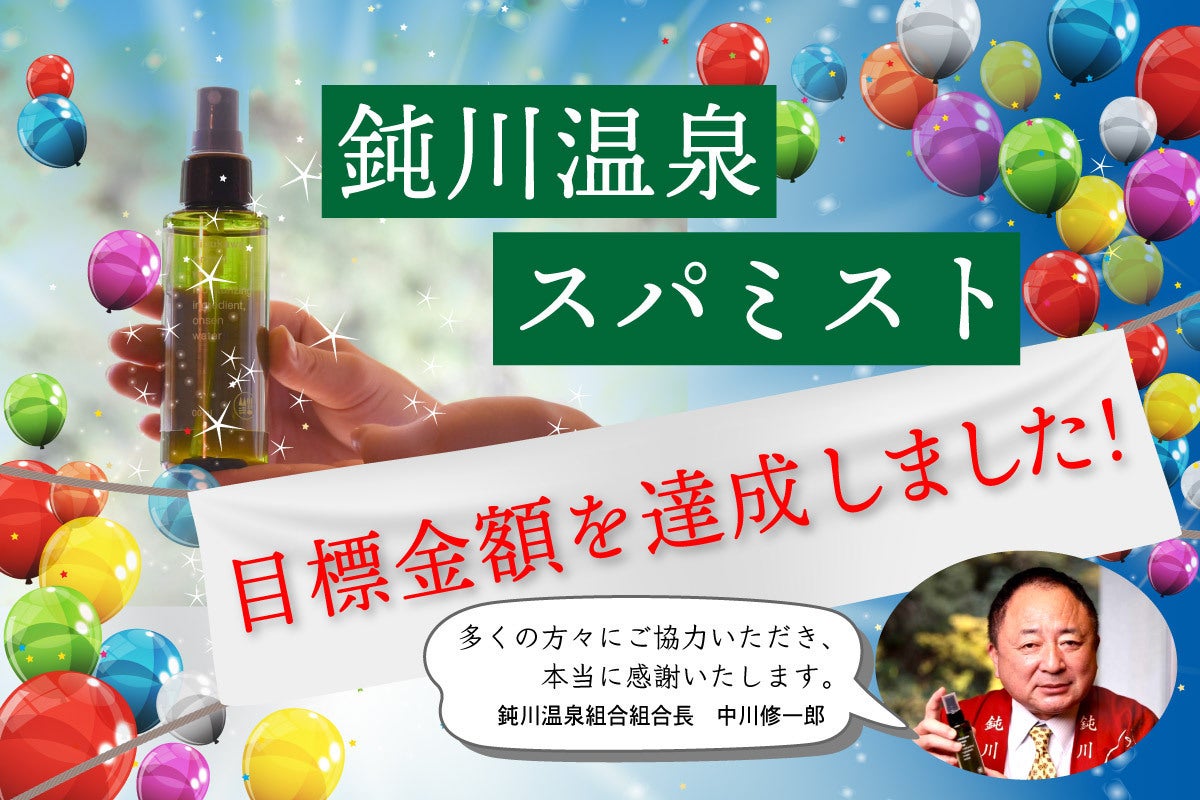 2024/01/01 12:00多くの方々からご支援をいただきまして、目標金額の130万円を上回る1,582,500円でゴール、目標を超えることができました。誠にありがとうございます。みなさまからのメッセージからも鈍川温泉の再生に対する期待をひしひしと感じました。地元の方だけでなく、本当に多くの方から愛されている温泉であることを再確認いたしました。この結果は、組合にとって大きな自信となりました。再生へ向けて各旅館、事業者が皆様の期待を受け、さらに頑張っていきます。今の寒い季節、暖かい温泉に入ってリフレッシュするもよし、3月中旬から下旬には鈍川名物の桜が咲き誇ります。癒しを求めて、鈍川温泉郷まで足を運んでいただきますと幸いです。組合員一同、熱く歓迎いたします。リターン品の発送は2月中旬を予定しています。しばらくお時間をいただきますが、ささやかなお礼と共に、皆様の元へ温泉ミストをお届けさせていただきます。引きつづきの応援、ご支援、どうぞよろしくお願いします。これからの鈍川温泉に期待していてください!!この度は誠にありがとうございました!! もっと見る