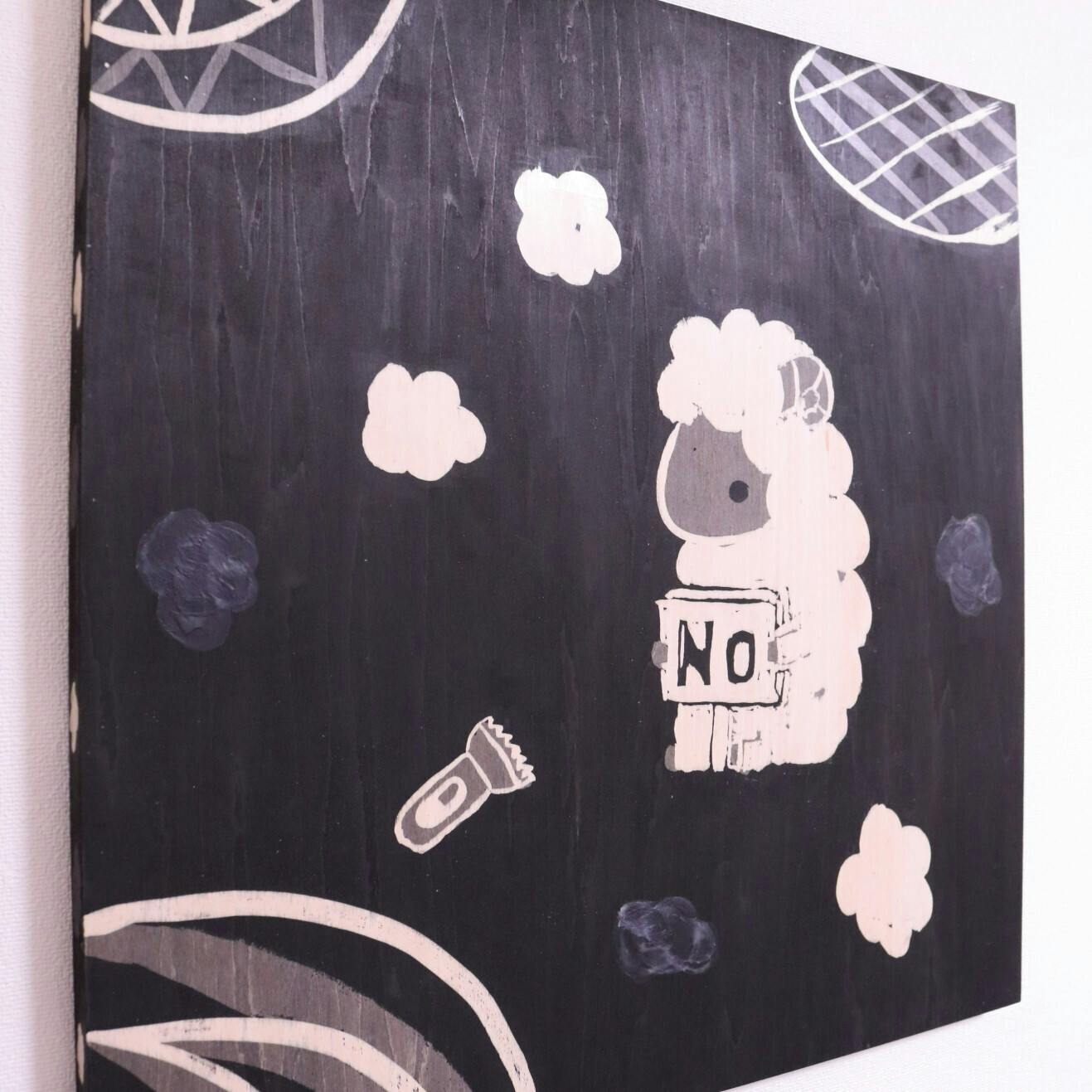 ひつじも毛を刈られるときに暴れたりするとは思いますが、今回はひつじに「NO」と書いた看板を持たせ明らかに拒否している姿を描きました。