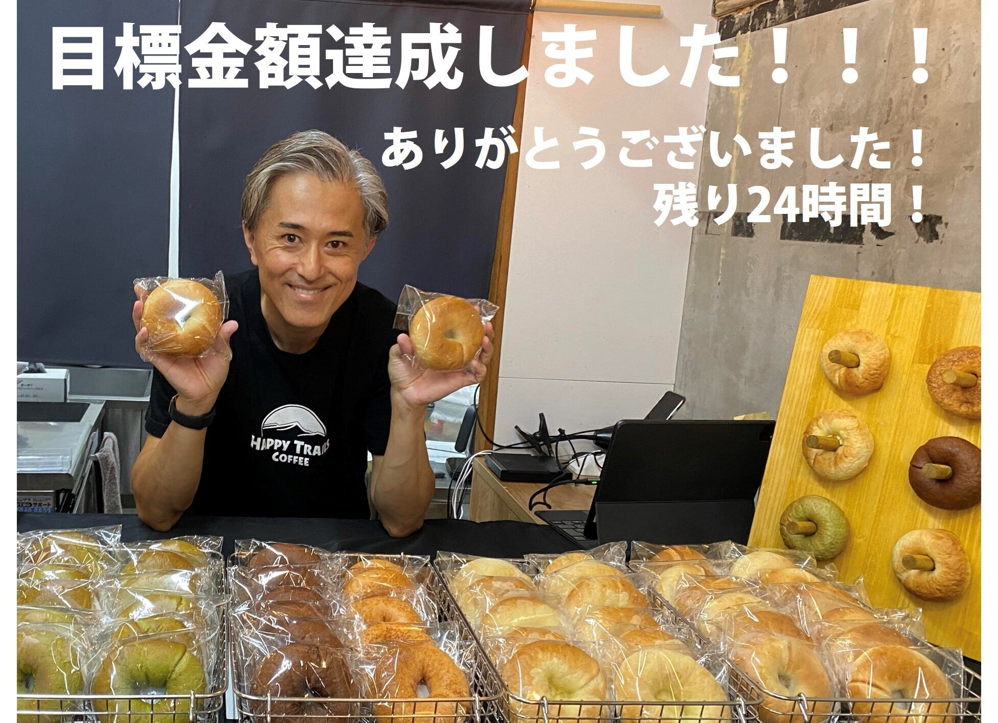 皆さまこんばんは!代表の橋口です。ついに目標金額達成しました!!!皆さまからのご支援に心よりお礼申し上げます!ありがとうございました!今回は「新作ベーグル開発の共創」をテーマに、「ビール×ベーグル」という日常的とは言えないペアリングで、チャレンジングなクラウドファンディングを開始しました。訴求性が高くないテーマであったことも要因してか、スタート開始からスローペースでしたが、コツコツ型のモードで着実に目標金額達成に近づき、25日目で目標金額達成となりました。ベーグル製造へ業態転換して丸1年。来月は「長崎県産品」として百貨店催事デビューも決まりました。ここまで成長できているのも、クラウドファンディングのみならず、ふるさと納税やEC販売、実店舗販売などを通したファンの皆さまのおかげです。心より感謝申し上げます!クラウドファンディングも残り24時間を切りました。クラウドファンディング終了後は、今回開発したベーグルも実店舗やECサイトで販売予定ですが、今回のようなお値引きは最初で最後です。最後まで皆さまからのご支援をお待ちしております!