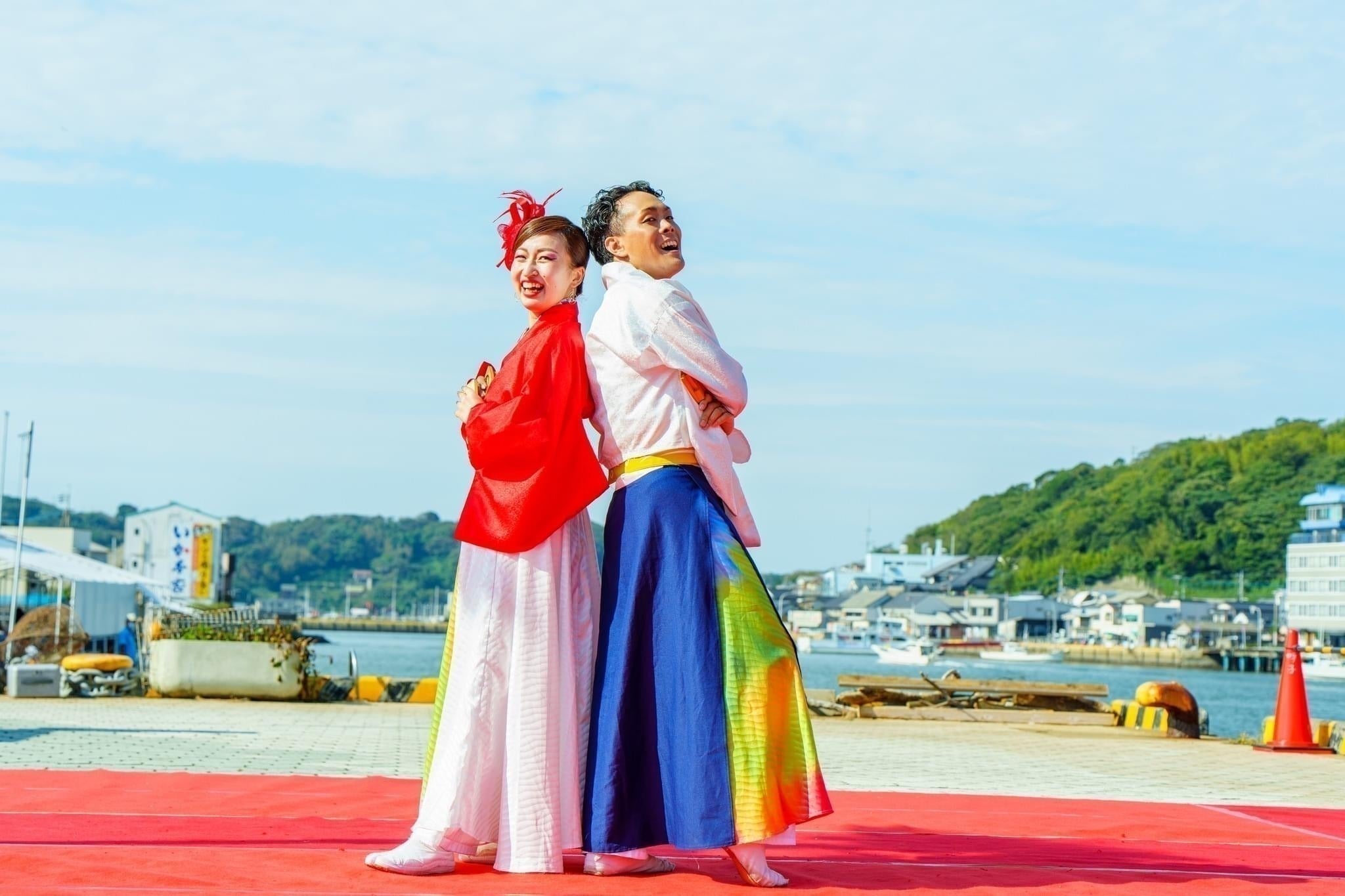 特徴として、佐賀の観光地の一つとしてイカで有名な土地と、鮮やかな海沿いの演舞会場を堪能していただき、演舞場にもなっている「呼子朝市通り」では観客と踊り子の距離が近く、踊る側も見る側も楽しめる一体感を作り出し、観光地ならではの活気を味わえる会場を擁しています。