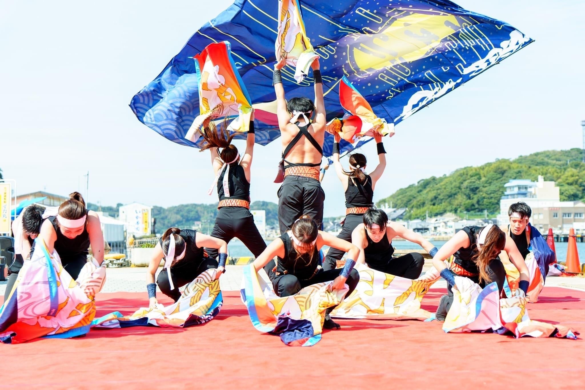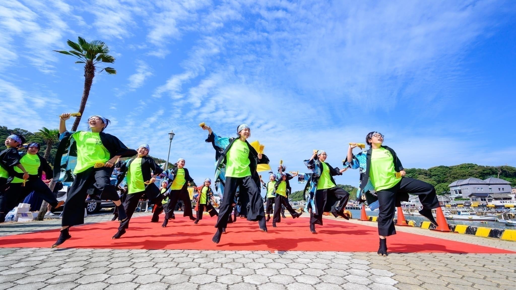 特徴として、佐賀の観光地の一つとしてイカで有名な土地と、鮮やかな海沿いの演舞会場を堪能していただき、演舞場にもなっている「呼子朝市通り」では観客と踊り子の距離が近く、踊る側も見る側も楽しめる一体感を作り出し、観光地ならではの活気を味わえる会場を擁しています。