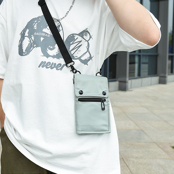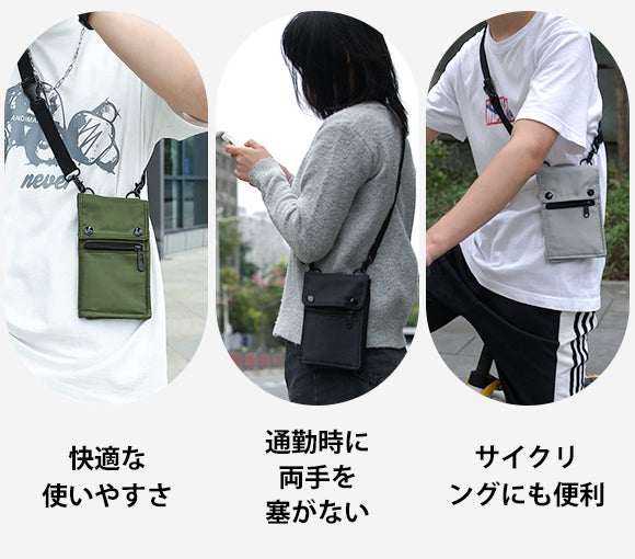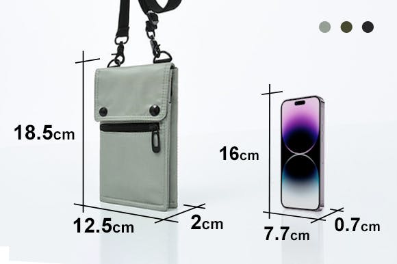 幅13cm以下のスマホ、小銭や鍵など細かな物をすっきりまとめて肩や首から下げ、必要な時にいつでもすばやく取り出せます。