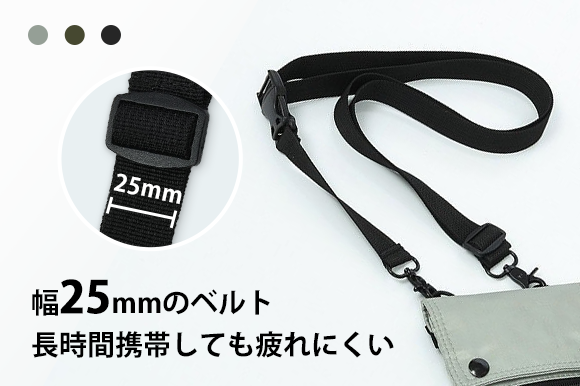 ベルトは幅25mmで、体に食い込みにくくなっており、長時間肩から下げても疲れにくくなっています。