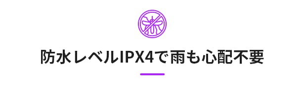 屋外での使用で心配なのが突然の雨。Y8EKはこの点を考慮してIPX4となっており、水滴や水しぶきがかかっても問題ありません。