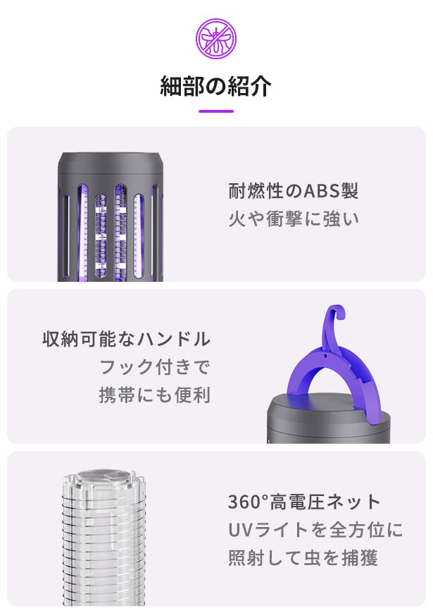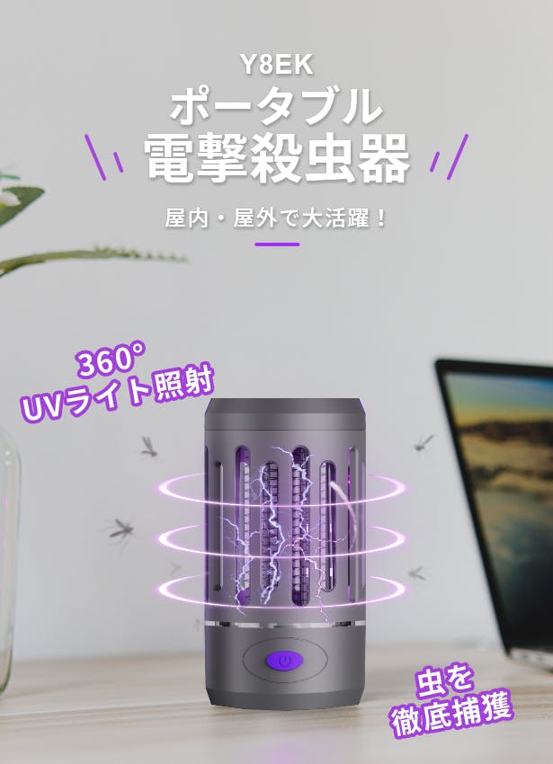 Y8EKは重さわずか200gの超軽量設計。UVライトを360°照射して虫をおびき寄せ、高電圧ネットで捕えます。化学薬品は一切使用しません。また、虫取り器としてだけでなく、懐中電灯やナイトライトとしても使用可能です。1200mAhの大容量バッテリー内蔵で、屋内で屋外でも長時間効果を発揮できます。