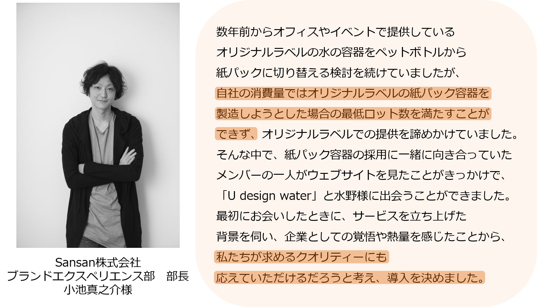 富永昌平は、富永貿易株式会社のミッション・使命として、紙パック製品でのオリジナル商品の展開をしないといけないと感じ、皆さんからの用命に応えたい一心で「U design water」の商品・サービス開発をスタートすることになりました。