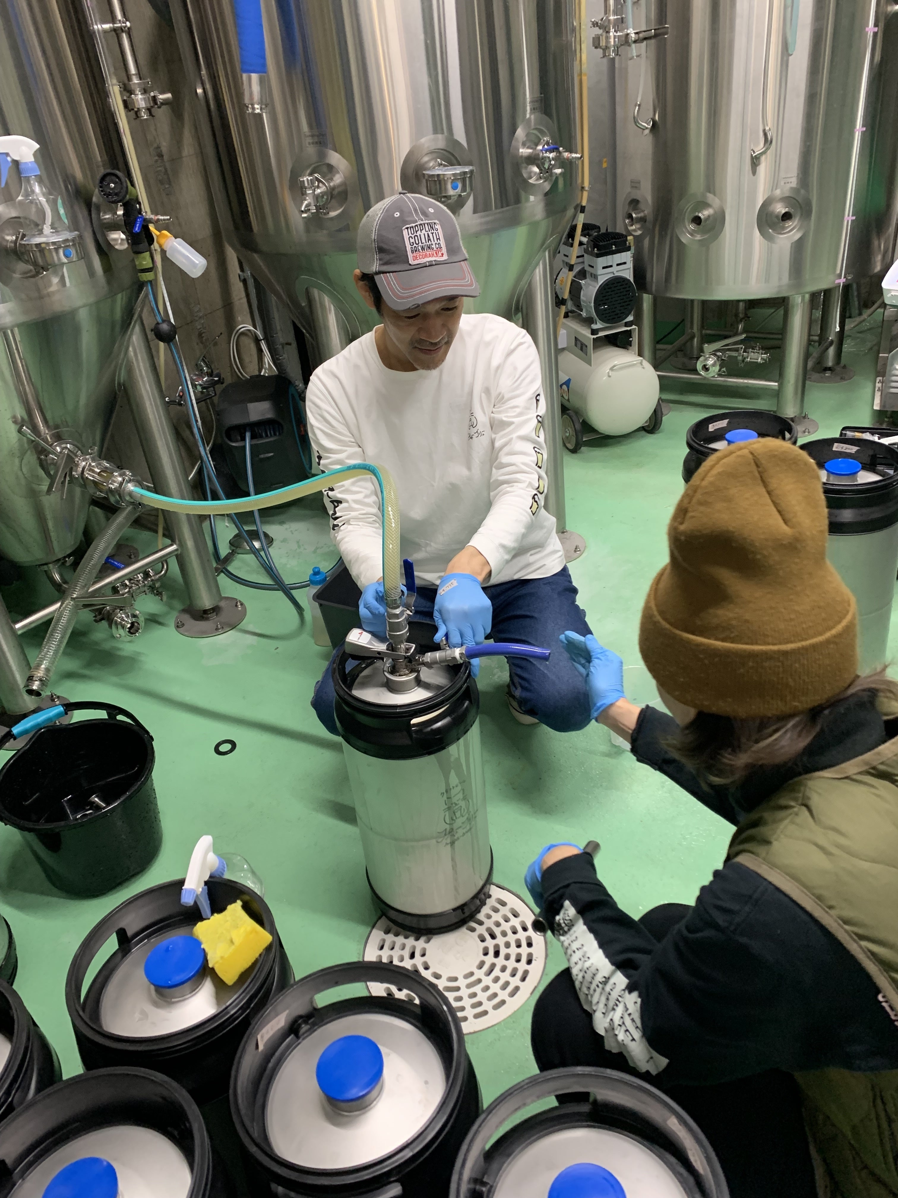 写真は、ビールを樽に詰めている様子です。