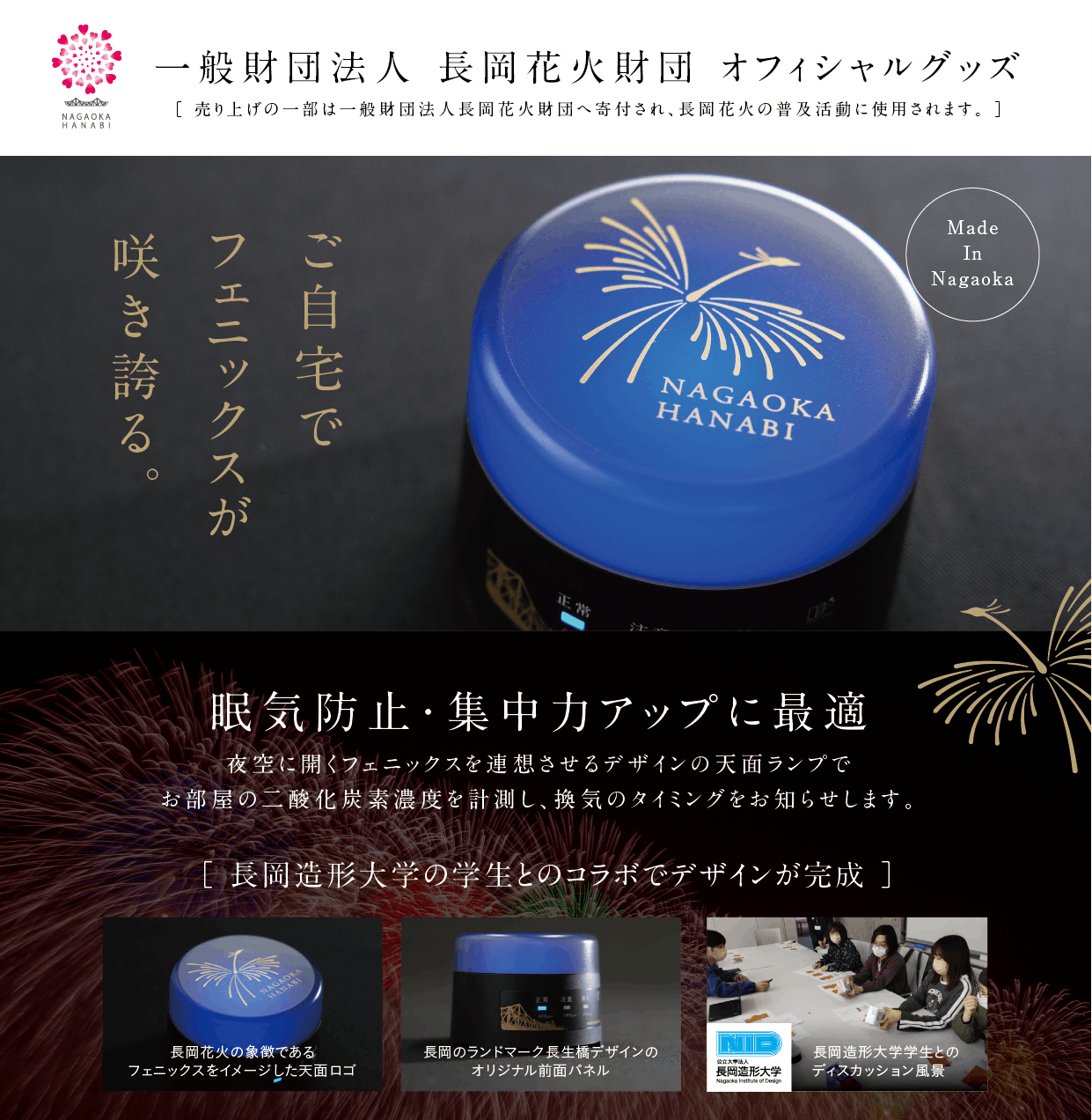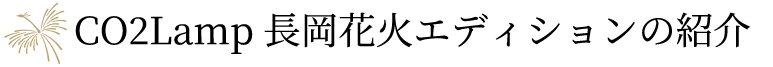 花火の夜空をイメージしたスモーク入りのランプの上で長岡花火のフェニックスが咲き誇ります。