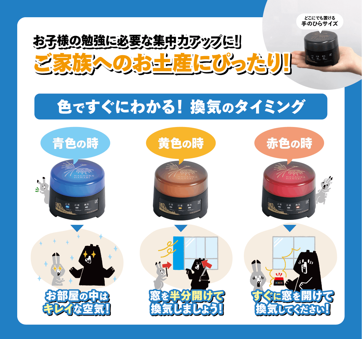 換気のタイミングがわかりやすく(3段階表示 青・黄・赤)お知らせ!