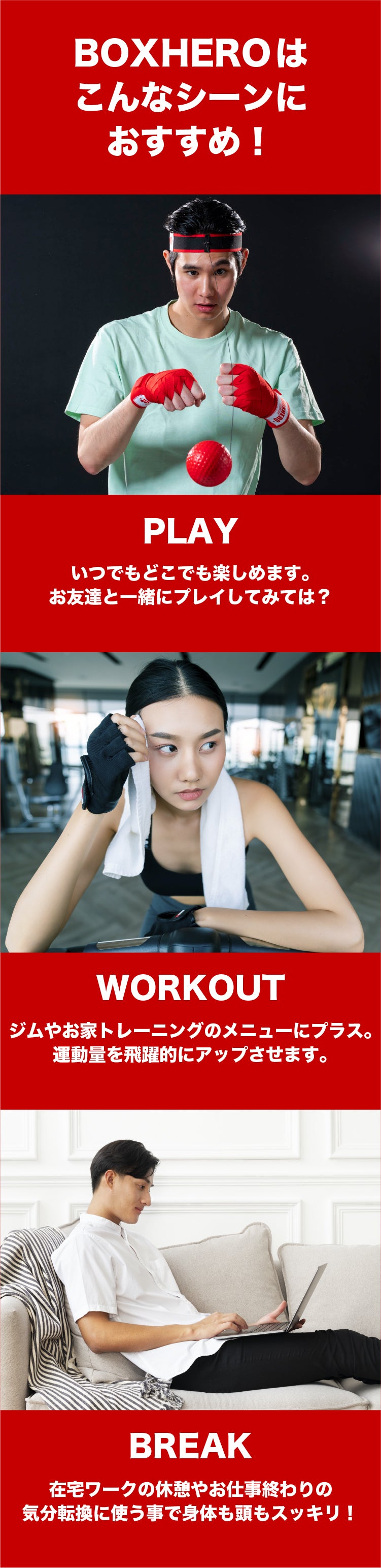 BOXHEROとは?1日1分ボクシング!BOXHEROは元プロボクサーの社長が本気でこだわって開発した、楽しくて、トレーニング器具より簡単にいつでも、どこでも、誰でも体を動かして健康習慣が身に付くボクシング商品です。眠った挑戦心を刺激し、強く健康な体を目指します!