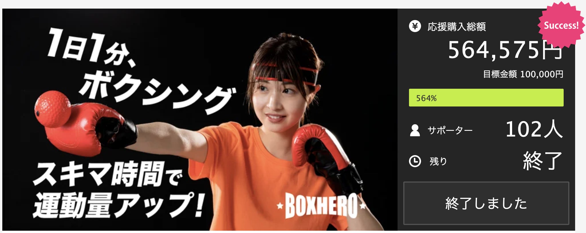 株式会社ONETREEが開発した、1日1分ボクシングの「BOXHERO」ボックスヒーローは、いつでもどこでも簡単にボクシングが体験でき運動習慣を作るフィットネス商品。クラウドファンディングサイトに掲載以来、約16万人がオンラインサイトに来店、100名を超える方にご購入いただきました!