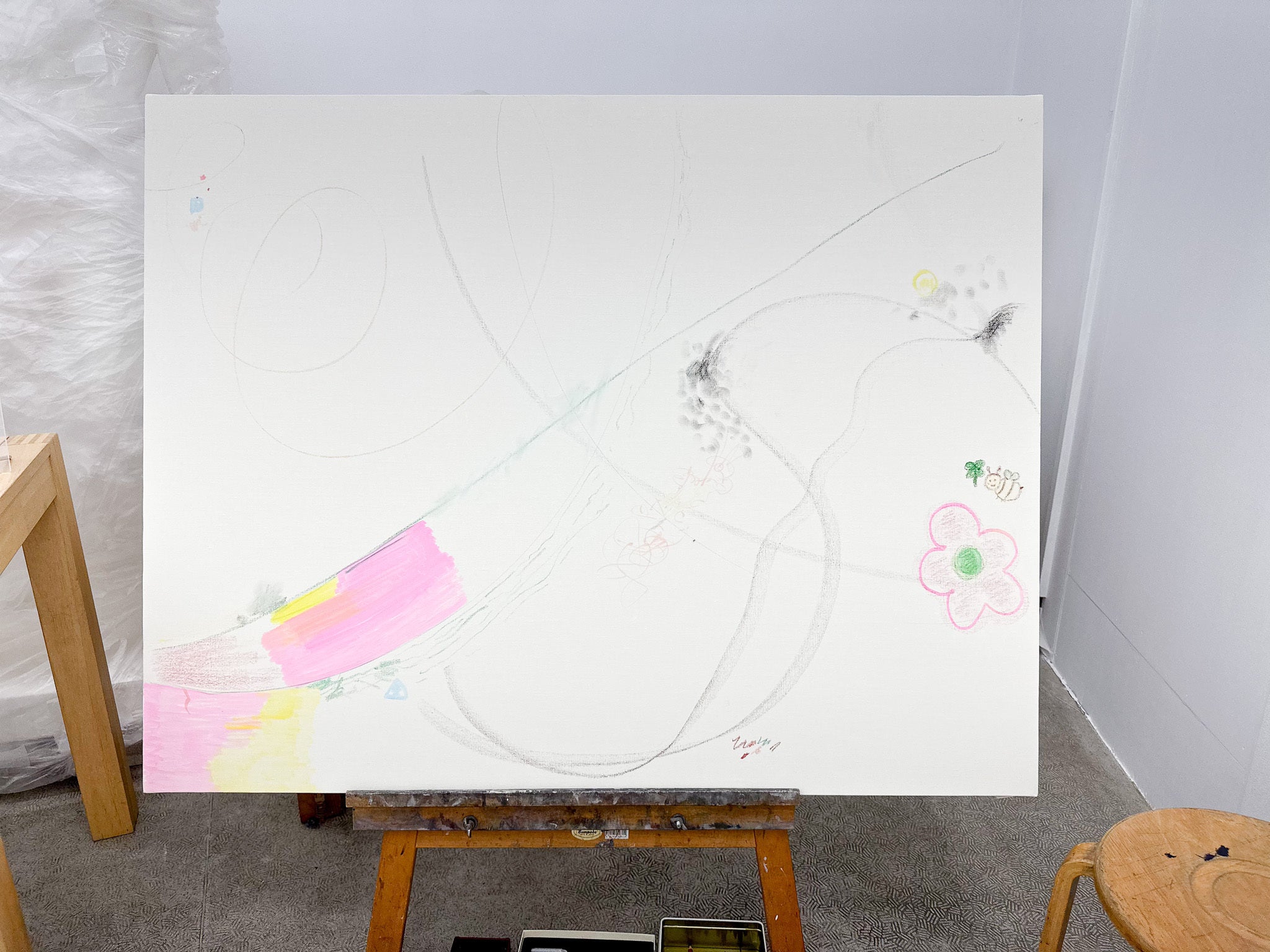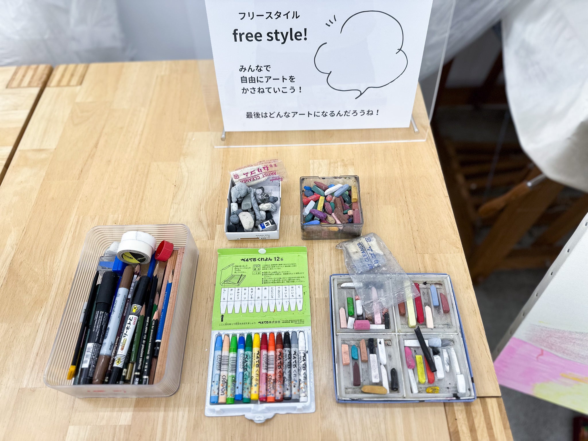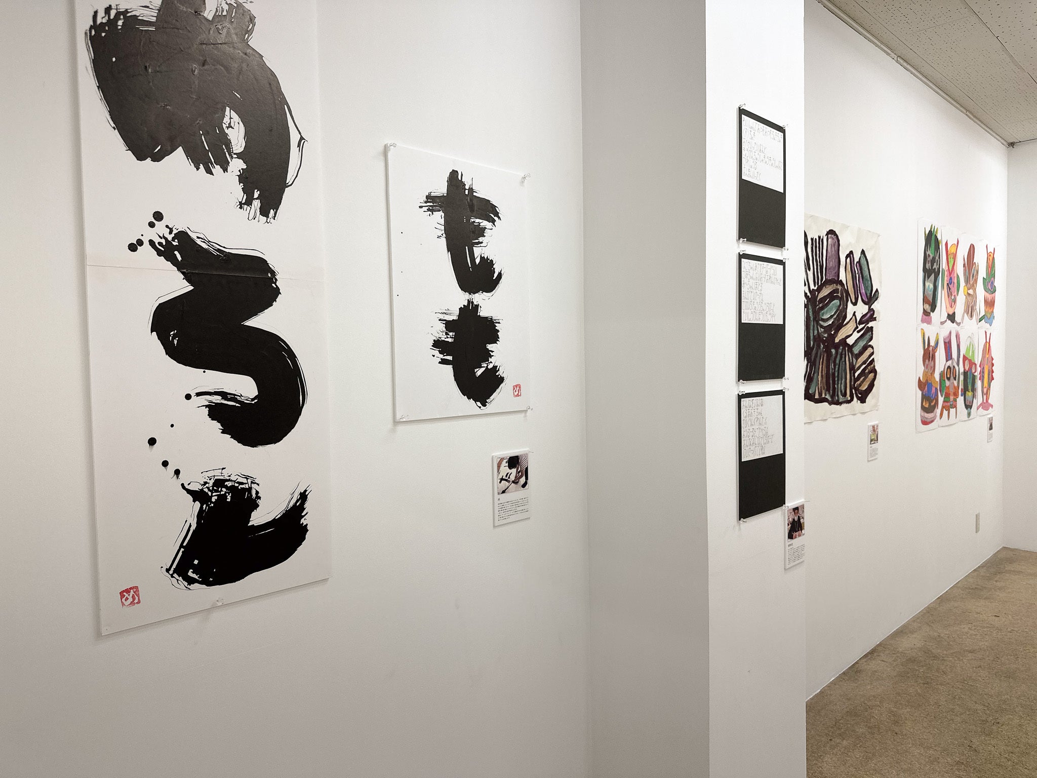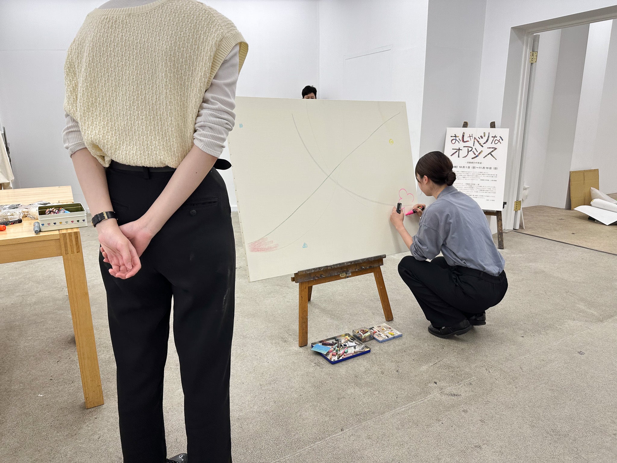今回の企画展の来場者皆さんに作品づくりに参加してもらい、5ヶ月後にどんな作品になったか振り返れられればと思い大きいキャンパスを常設しております。ぜひ皆さんも来場時に何か描いていってください。本日早速数名書き込みしました!
