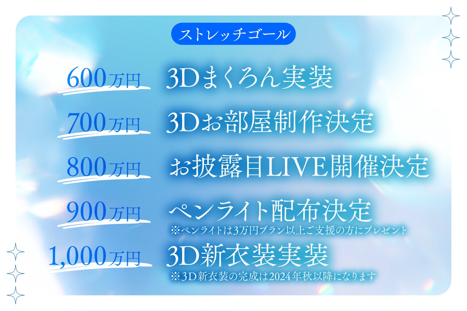 ・3D化記念動画にお名前掲載・限定Twitterご招待・お礼動画(2D/3D)・デジタルサイン入り待ち受け・アクリルキーホルダー&缶バッジ ・直筆サイン入り1stシングル・アクリルスタンド・アクリルブロック・直筆サイン入りA1ポスター・あなたのお名前呼び動画・あなたのお名前入り直筆サイン色紙・直筆サイン入り複製原画・おまけの私物・あなただけに送る特別ライブ