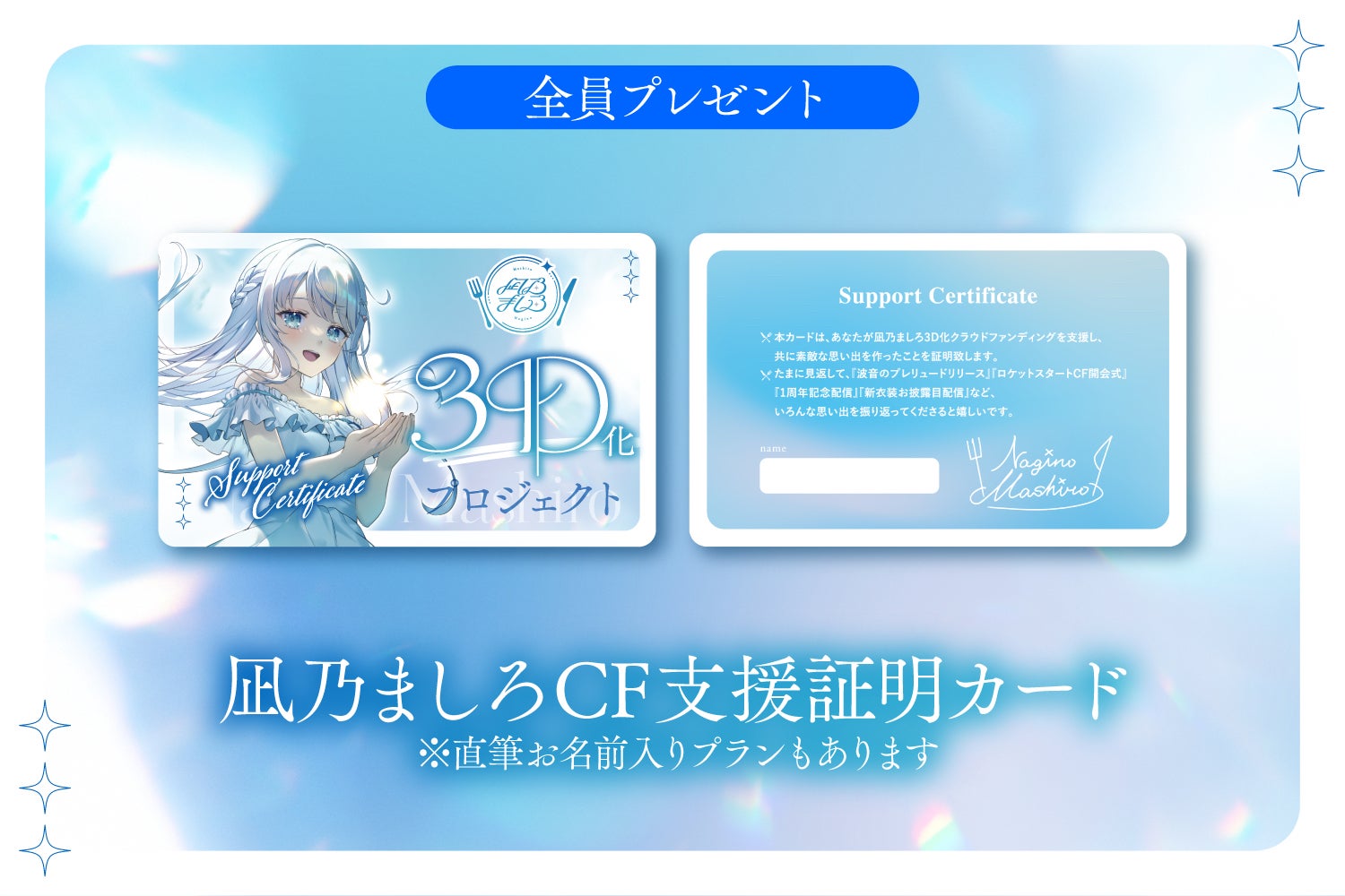 ご支援への感謝の気持ちを込めて、3D化記念動画に任意のお名前を掲載致します。ましろと一緒に3Dモデルを作った証を刻んでいただけると嬉しいです…!
