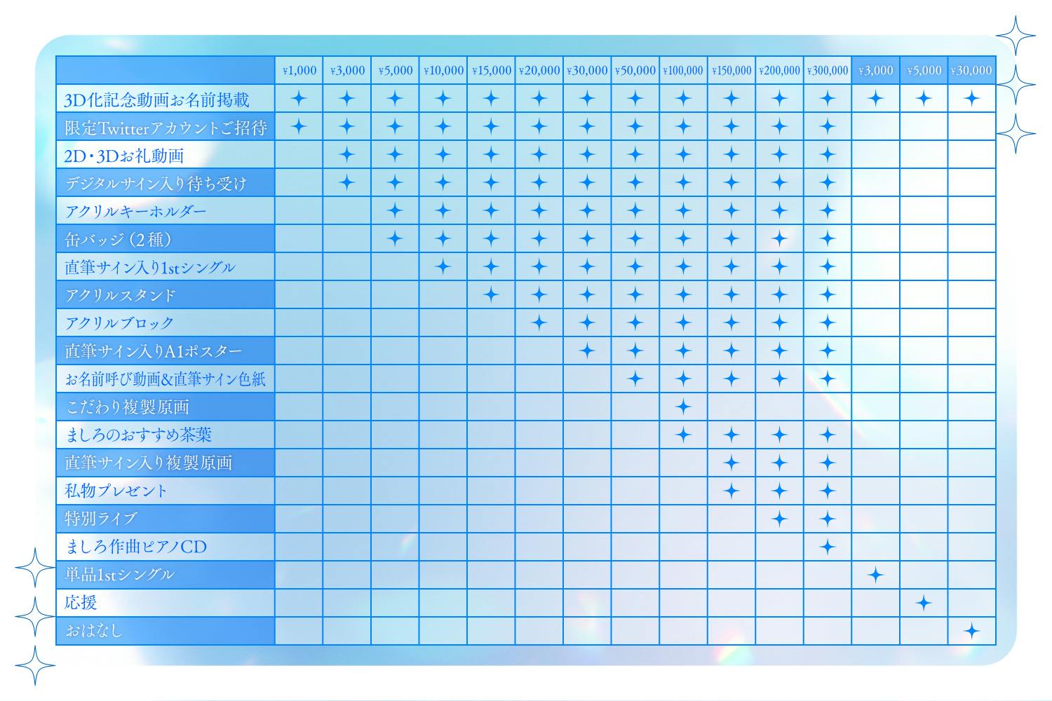 ・3D化記念動画にお名前掲載・限定Twitterご招待・お礼動画(2D/3D)・デジタルサイン入り待ち受け・アクリルキーホルダー&缶バッジ ・直筆サイン入り1stシングル・アクリルスタンド・アクリルブロック・直筆サイン入りA1ポスター・あなたのお名前呼び動画・あなたのお名前入り直筆サイン色紙・直筆サイン入り複製原画・おまけの私物・あなただけに送る特別ライブ