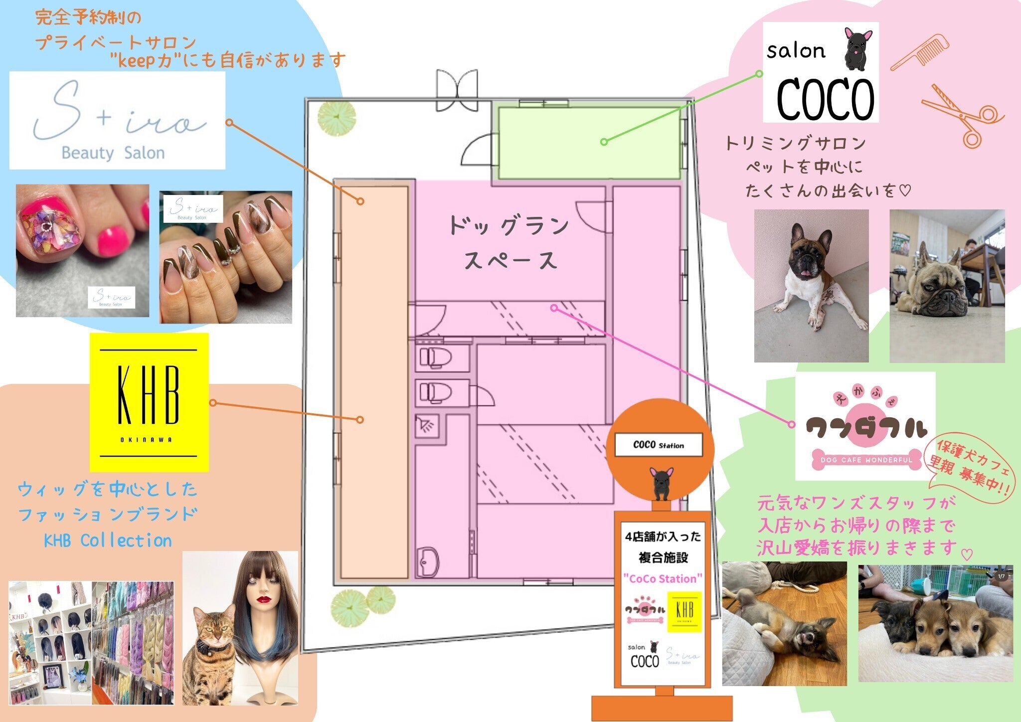 私たちの計画には、KHBの喜友名華恋さんとS+iroの我那覇沙奈香さんも賛同し、一緒にお店を盛り上げていくことになりました。彼女たちも保護施設から犬や猫を引き取っており、ワンちゃんやネコちゃんを家族として迎え入れています。この複合施設では、異なる業種の店舗を集め、来店されたお客様へ「保護犬施設」の認知を高めることを目指しています。