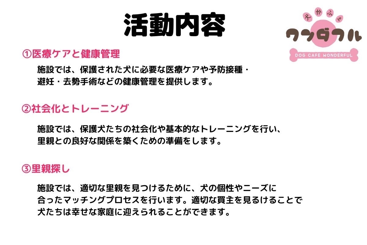 私たちは、地域の保護犬問題に貢献するために、犬かふぇワンダフルさんと協力して、嘉手納町に保護犬施設を立ち上げることを目指しています。