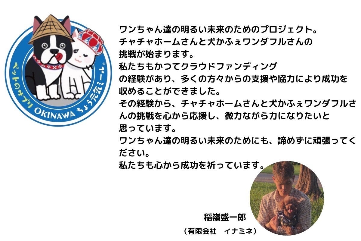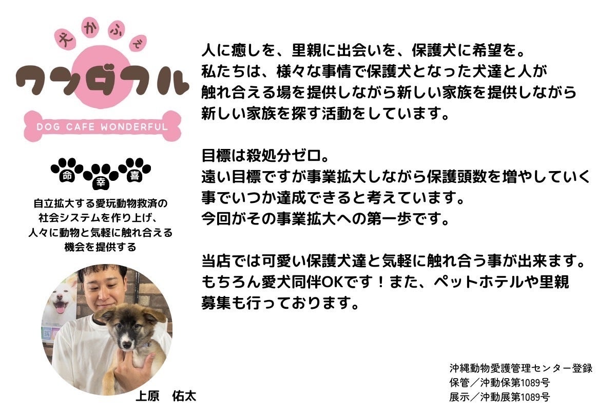私は元々動物が大好きで、当社の看板デザインには自宅で飼っているフレンチブルドッグを取り入れています。約2年前に犬かふぇワンダフルの上原佑太さんと出会いました。当時、上原さんは2店舗目の開業を考えており、そのお話を通じて保護犬活動や沖縄県中部地区の保護犬施設不足について知る機会となりました。
