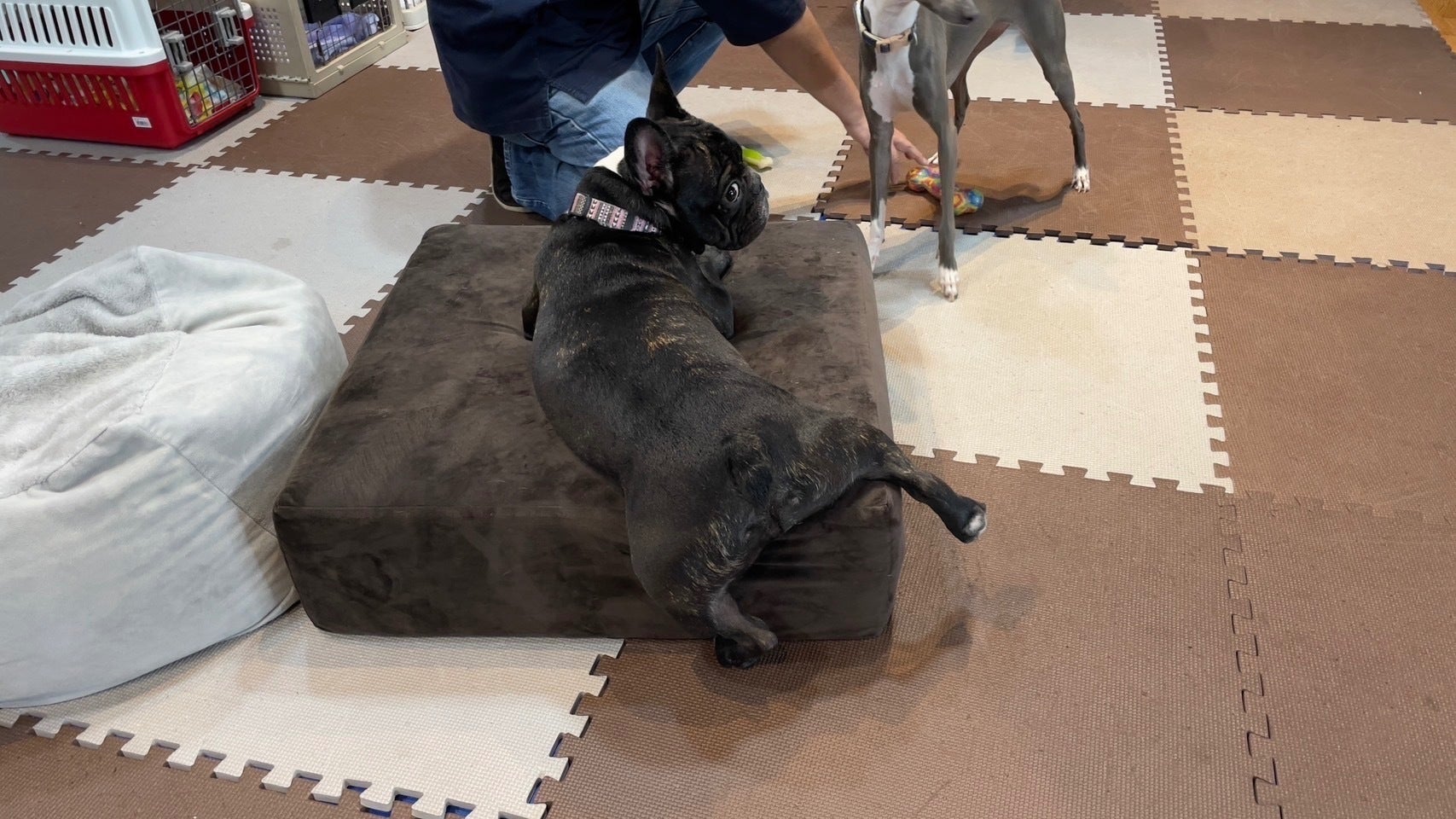 【ワンちゃん達とお客様が触れ合い、お客様に癒やしの空間を楽しんでもらう】