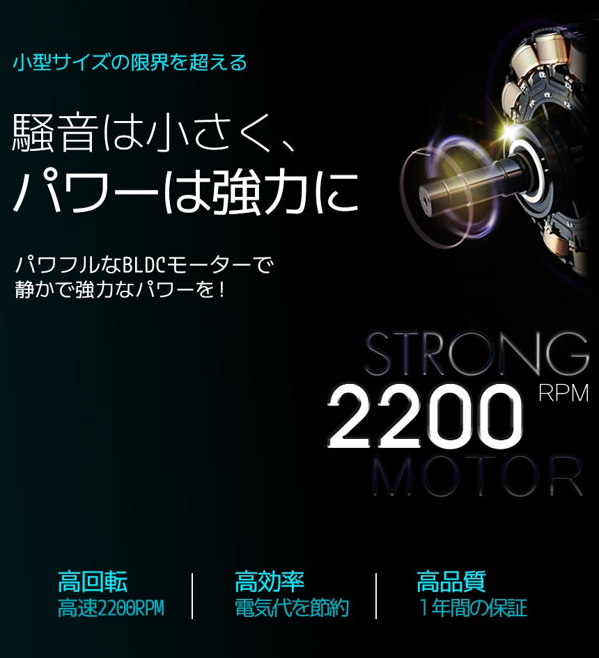 アイサーキュルは、2200RPMのBLDC(ブラシレスモーター)を採用し、従来のDCモーターではできなかった高いパワー、節電、低騒音が実現できました。