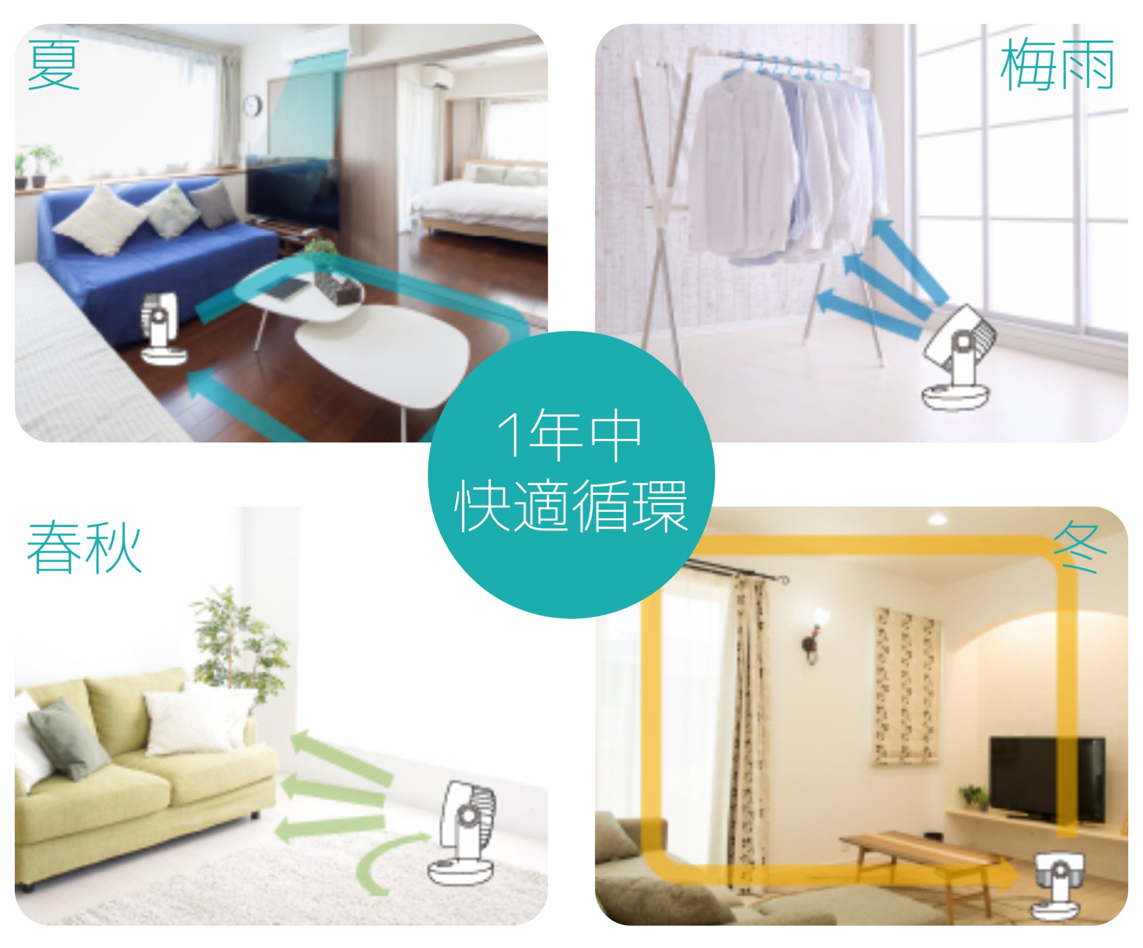 空気を循環させることで夏は冷房の効率が上がり、冬は暖房の効率が上がり、花粉やハウスダストは多い春秋は空気清浄機と同時に使用することによって効率的な換気ができます。