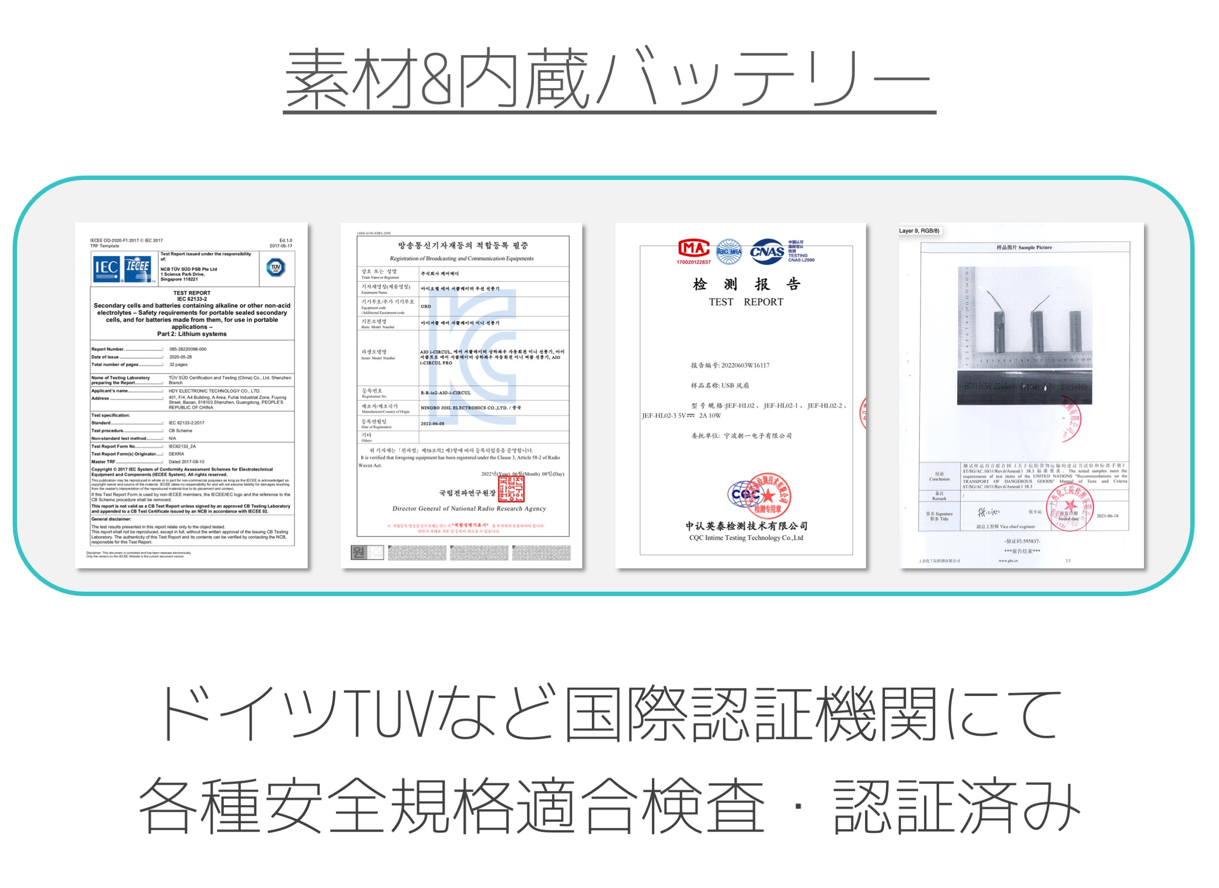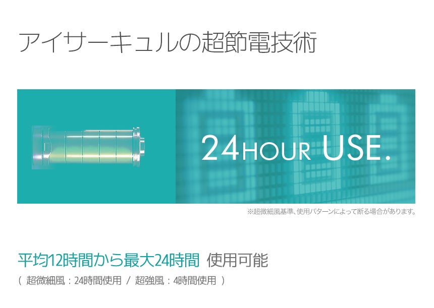 アイサーキュルは、超節電技術を活用し、超微細風モードで最大24時間使用が可能です。5段階風でも12時間ほど使用可能なので、日中充電せずにご使用が可能です。