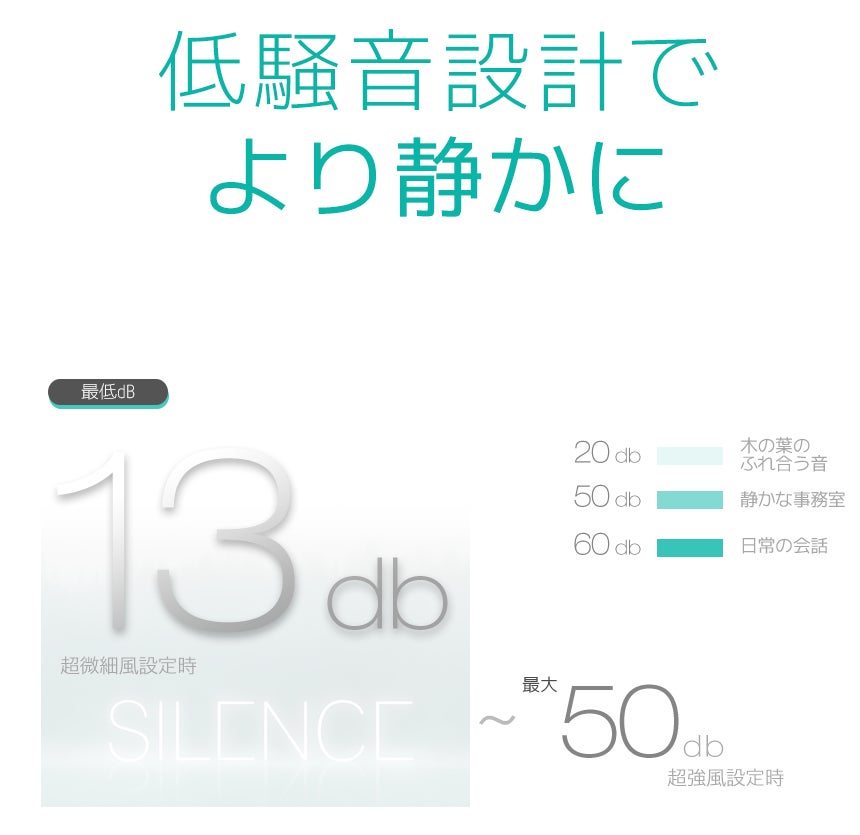アイサーキュルは、BLDCモーター、独自の7枚羽根、超微細風モードなどにより、13dBという超低騒音を実現しました。更に羽根の形状を最適化し、中風でも耳障りになりにくい優しい風を送り続けます。