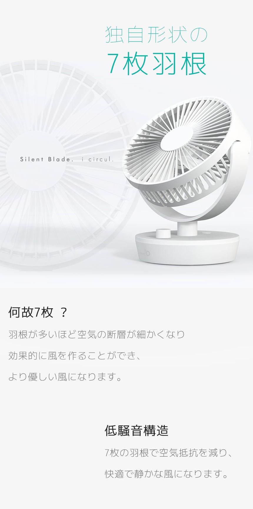 アイサーキュルはスリムな7枚羽根を採用することで、空気抵抗を減らし、風量を効率良く作りながらも静かな風を生み出します。