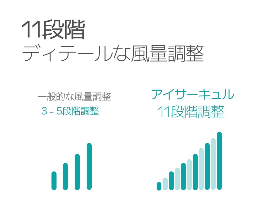 1段階の超微細風から11段階の超強風まで、場所や使用目的など必要に応じて風量を細かく調整できとても便利です。