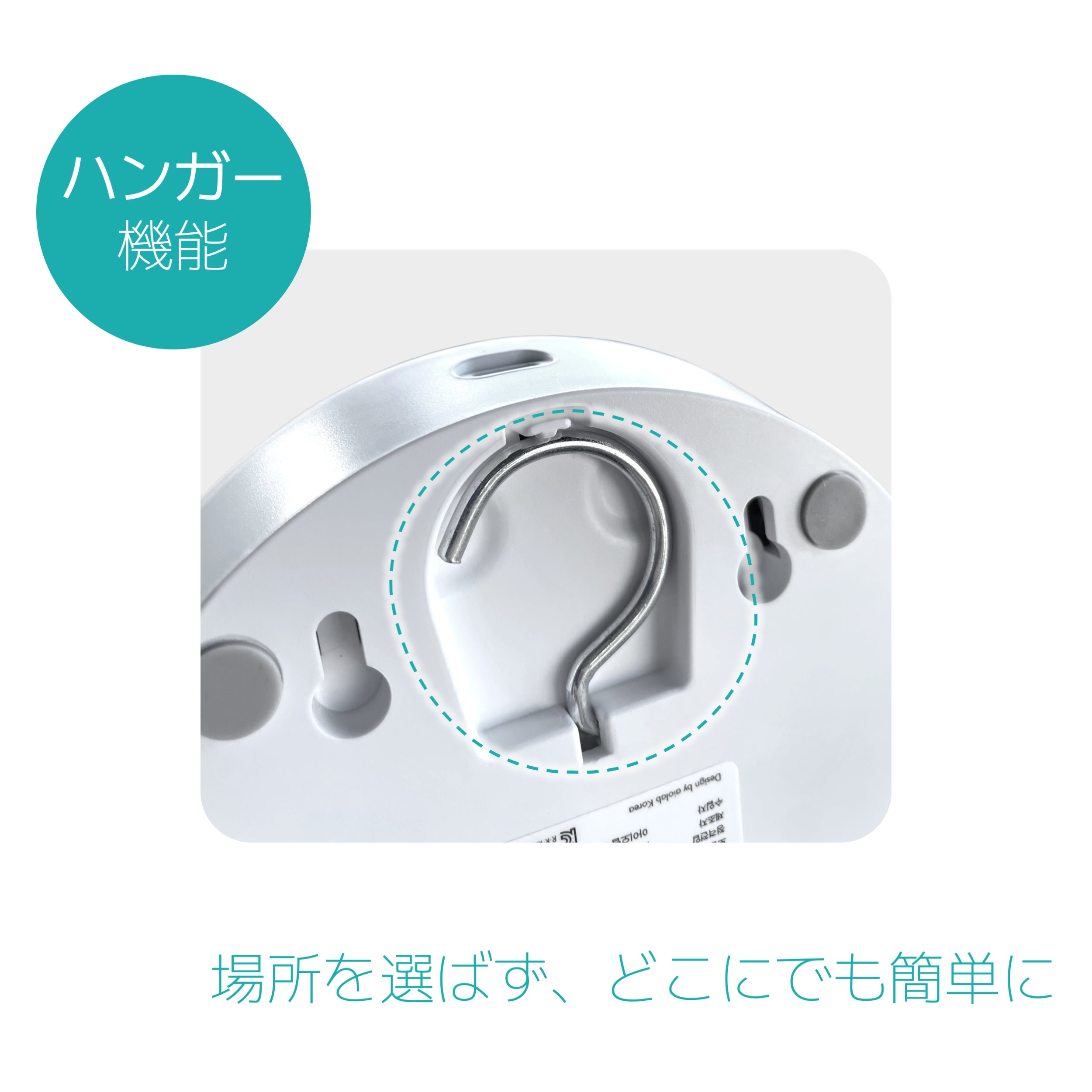置く場所を見つけられない場合には、ハンガー付きなので、アシストグリップなどにかけることも可能です。