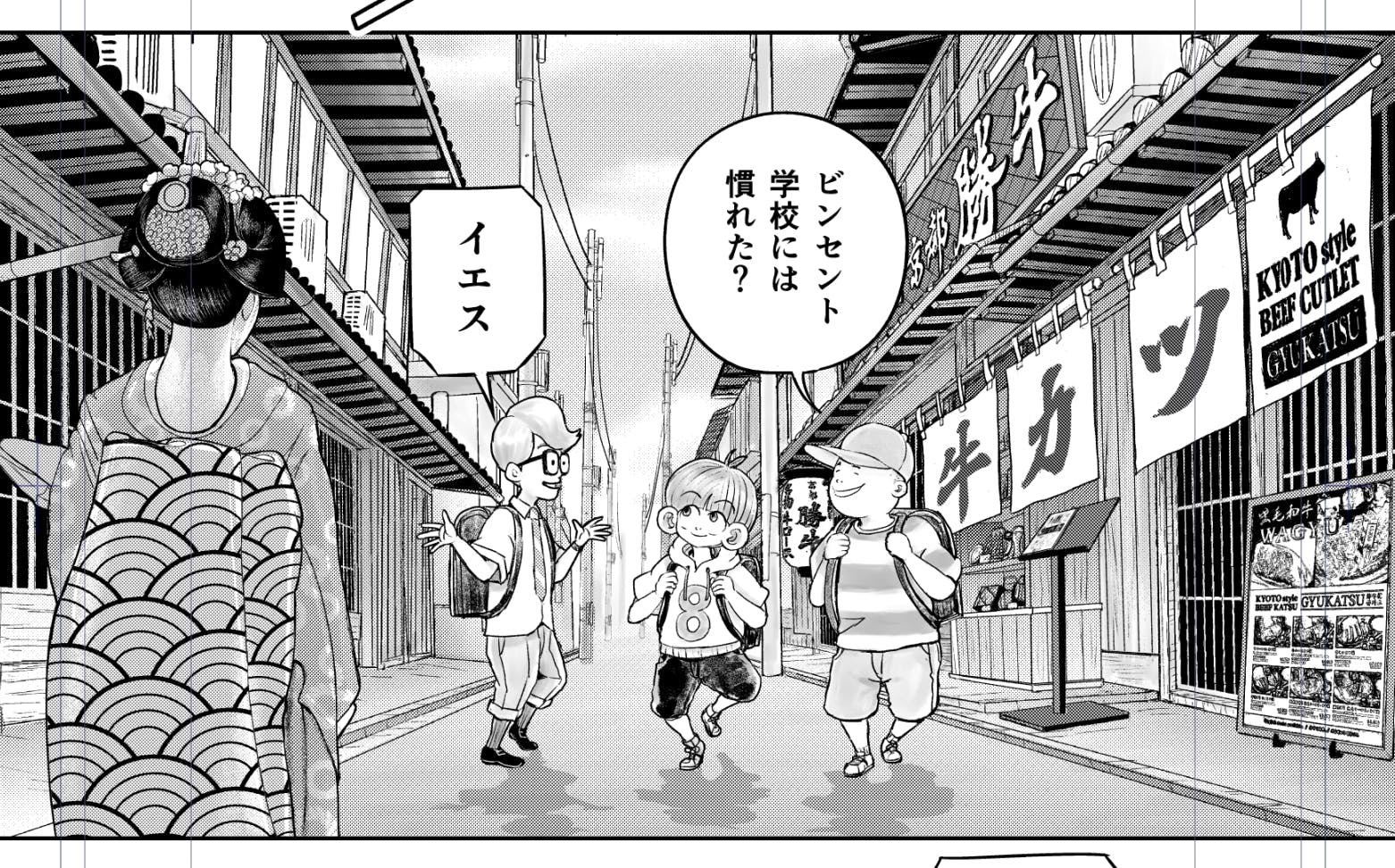 ページの真ん中にドーンと入るのでとても目に入ってきます。「勝牛」さんのページは同じサイズのコマで夕方のシーンに再び登場しますので2ページ登場する形です。(最終「勝牛」さんのリターンは一部修正が入る予定)「京都 勝牛」は各店舗にも「スサノオくん」を置いていただけるようで、とても嬉しいです!!!!