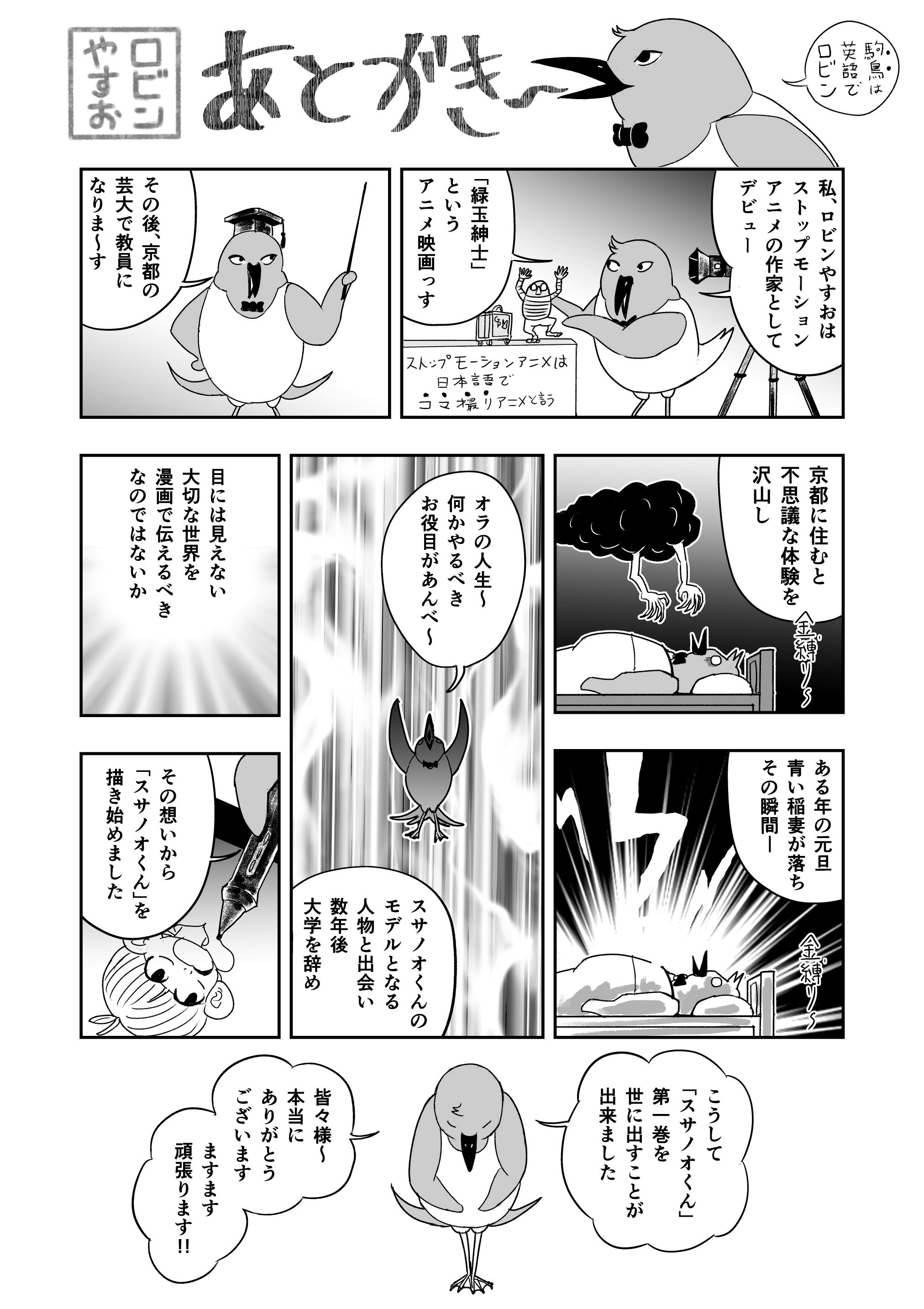 上の画像は、僕が「スサノオくん」という作品を描き始めた経緯を短く説明した「スサノオくん」1巻の最後にあるあとがきです。神様や見えない世界をもっと豊な形でみんなに伝えられないか…人の根底に流れるテーマを楽しくみんなが喜ぶ物語にして伝えられないか…そこから漫画という手法を選ばせて頂きました。
