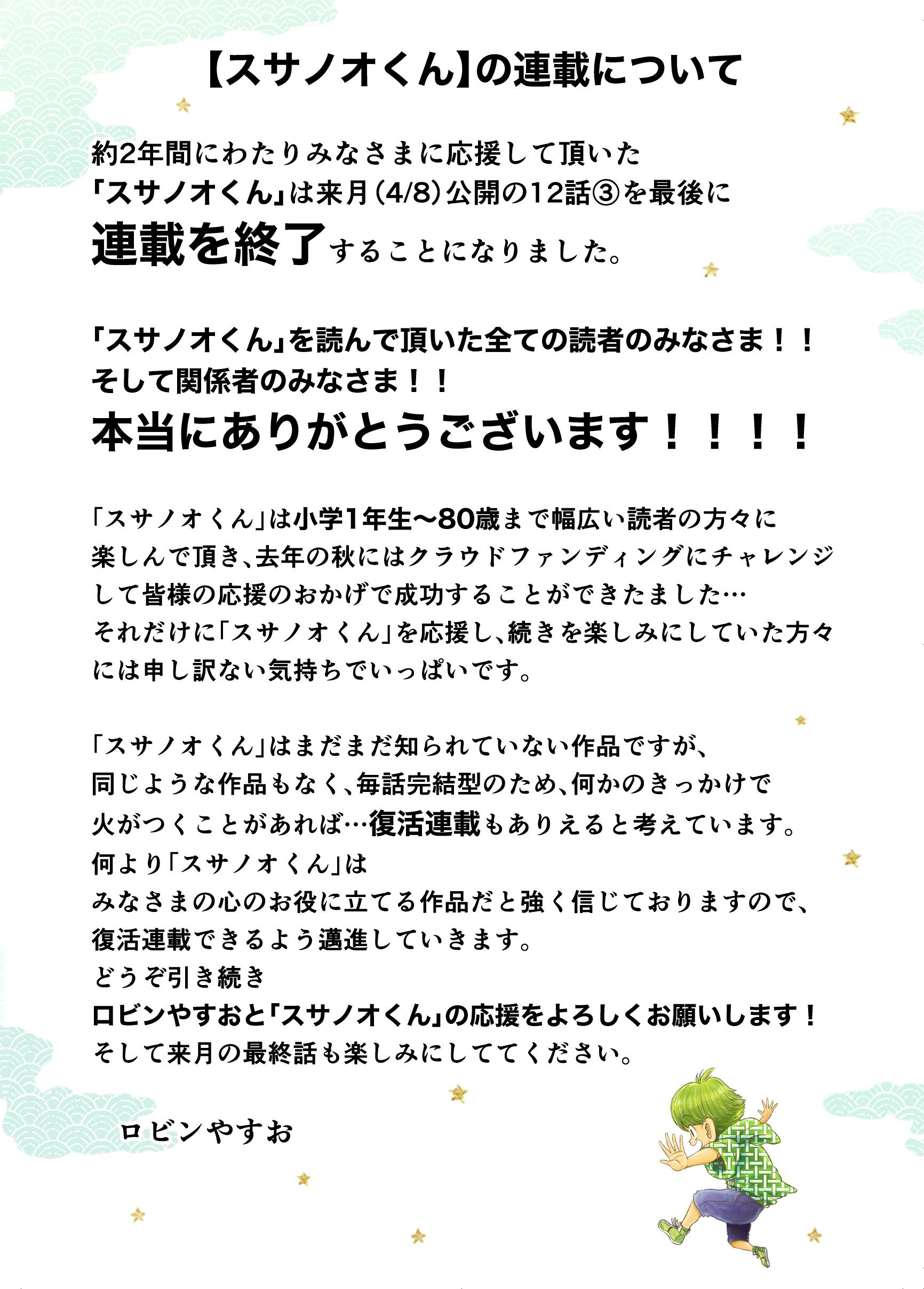 必ずや「スサノオくん」の連載を復活させますので、引き続き「スサノオくん」と”ロビンやすお”の応援を、何卒よろしくお願いします!!!!