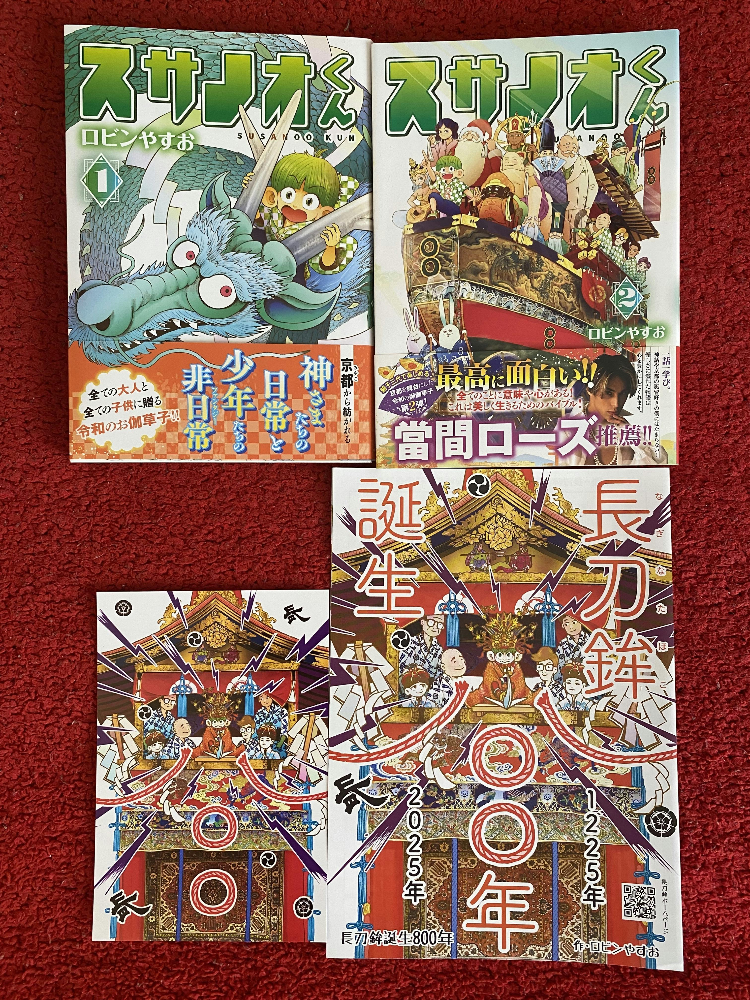 今年はコラボさせて頂きました7つの山鉾さん全てでスサノオくん1・2巻とポストカードとリーフレットのセットで1500円で授与させていただきます。上の画像は長刀鉾さんで1・2巻セットを授与した場合の内容となります。各山鉾さんによってポストカードとリーフレットは変更します。