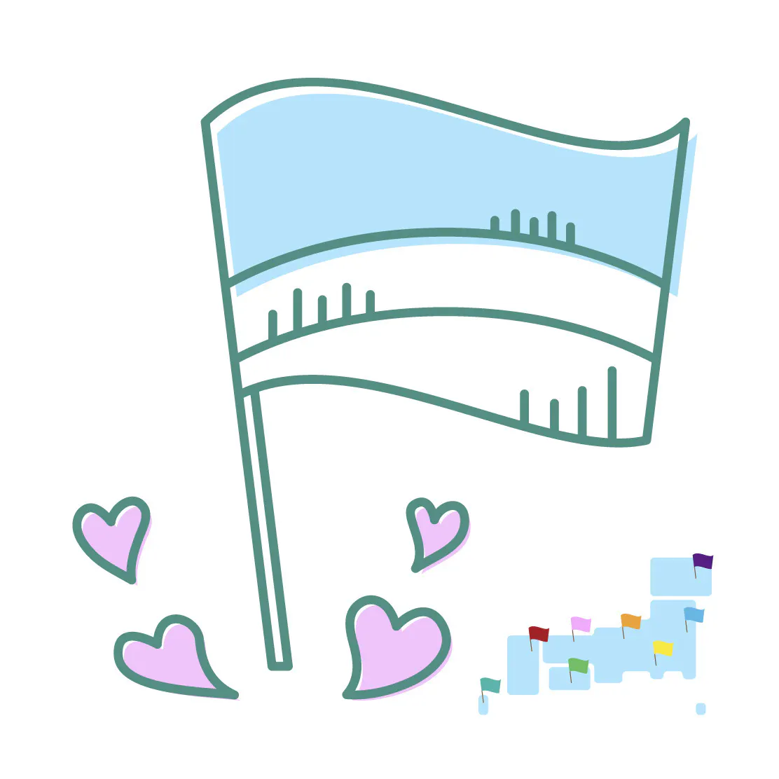 日本各地に受け継がれてきた草原は、構成する生きものも、人の関わりかたも様々ですが、空が開けて、風が通り抜けて、草が揺れる風景は、共通しています。そんな草原の風景がこれからも人が関わり受け継がれていくことを、旗を描いている様子に置き換えて表しました。