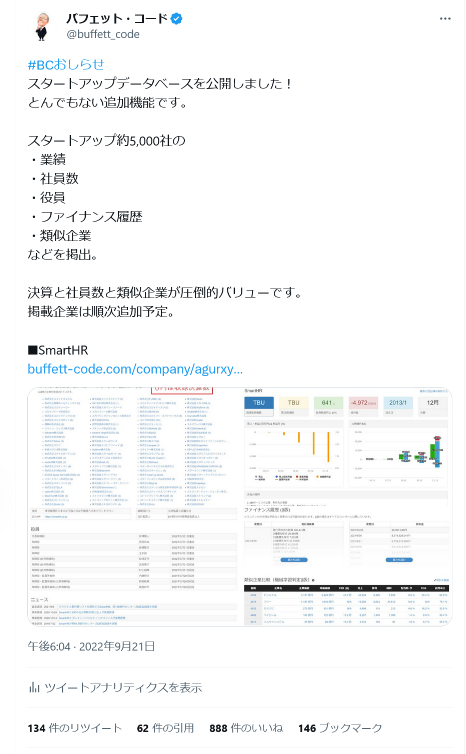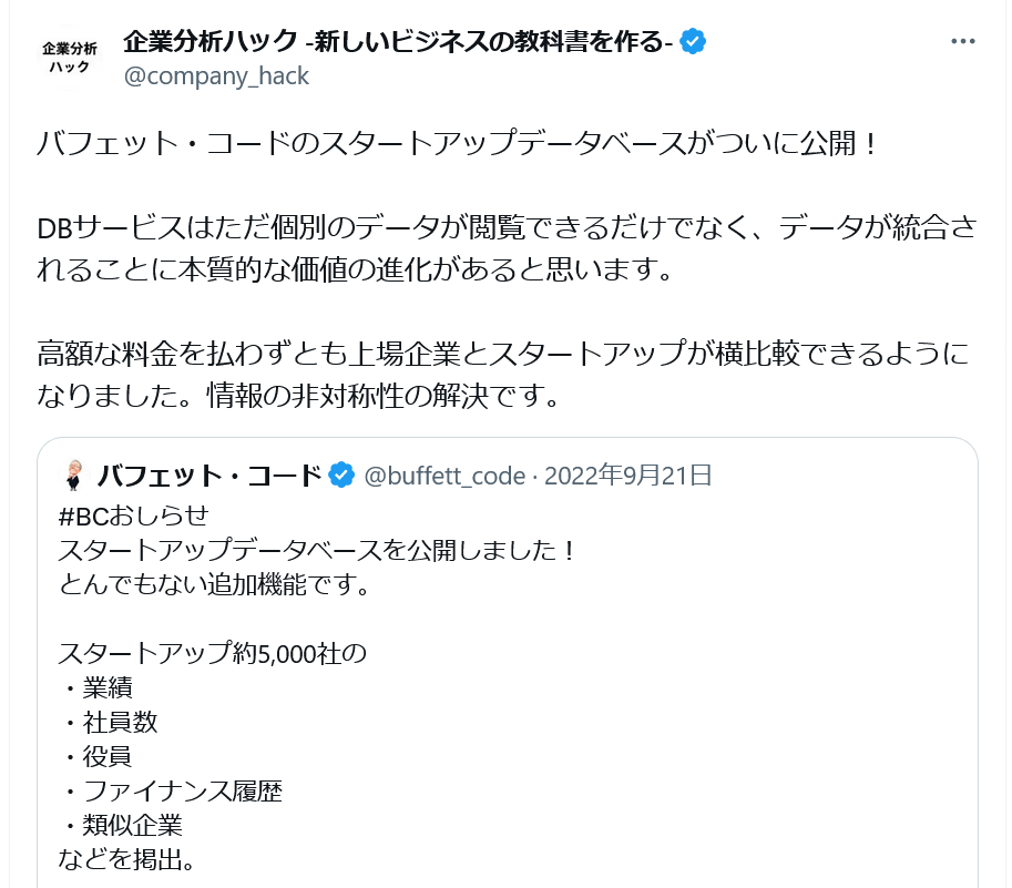 バフェット・コードでは、昨年(2022年)の夏にスタートアップデータベースを公開しました。