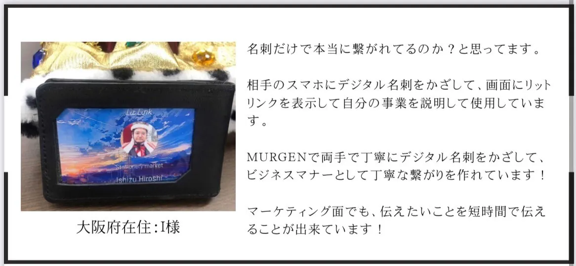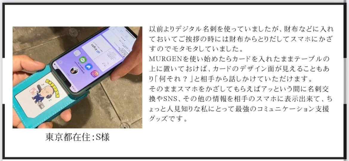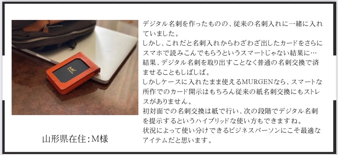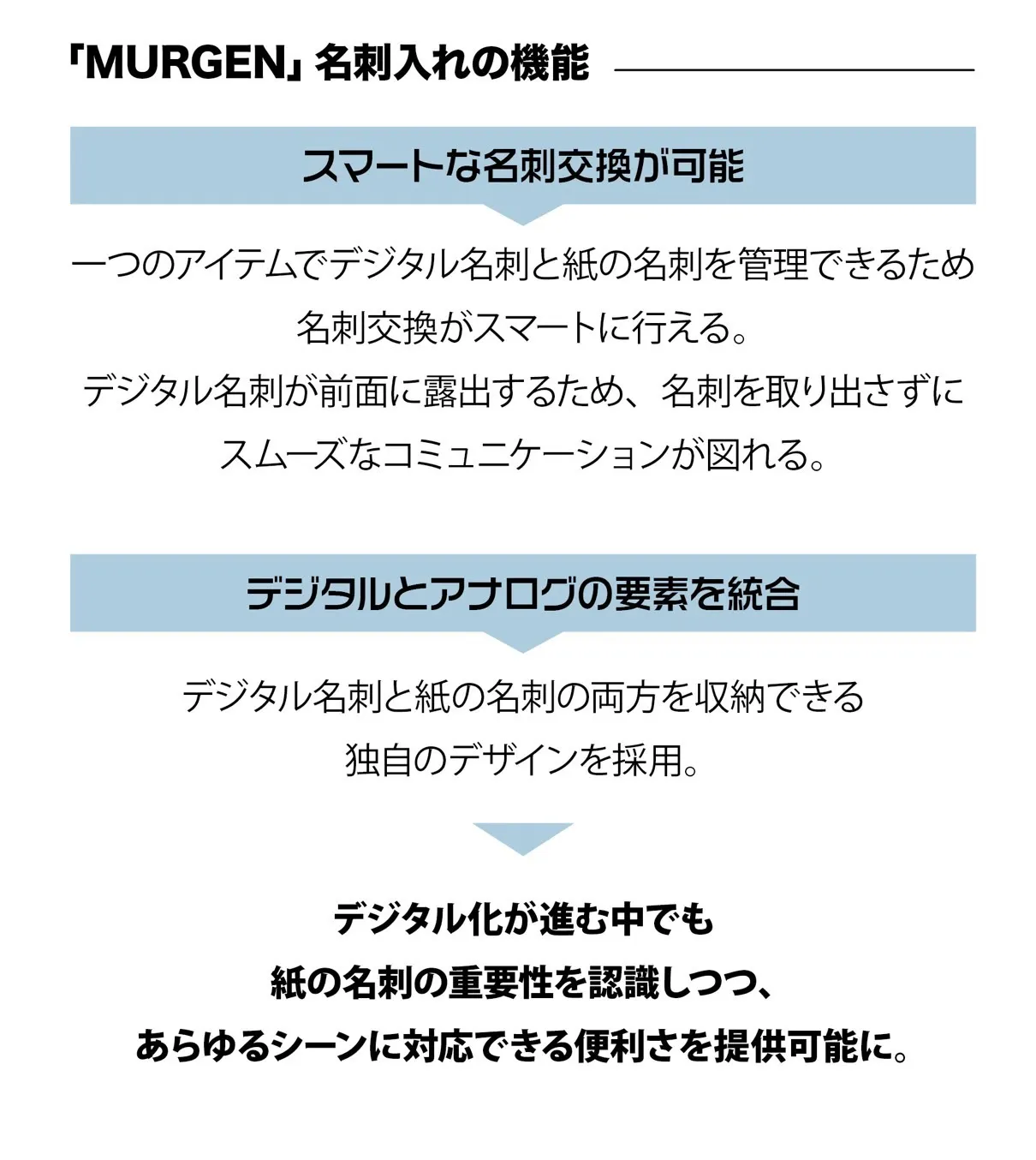 デジタル名刺を従来の名刺ケースに収めるのではなく、MURGENと共に持つことで単なるアイテム以上の意味合いを得られます。