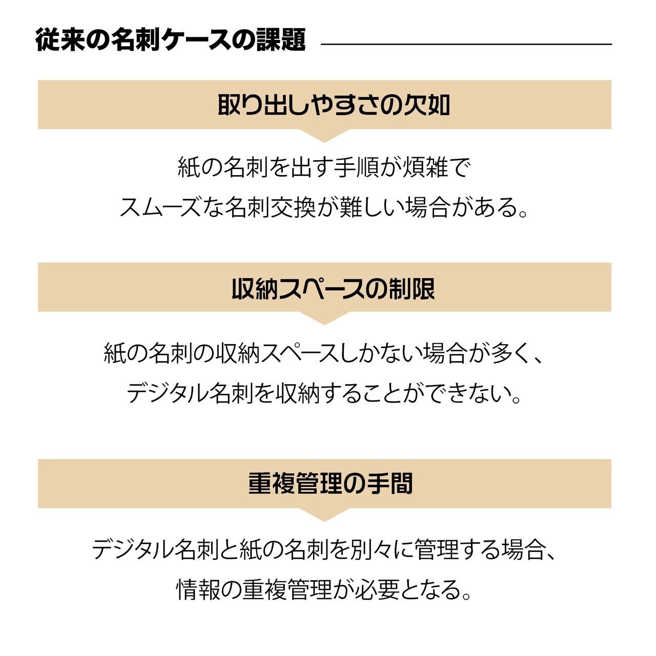 名刺の利用シーンにおいて、従来の名刺入れでは紙の名刺を取り出す手間や煩わしさがあります。デジタル名刺が普及し始めている現在でも、その課題は変化していません。