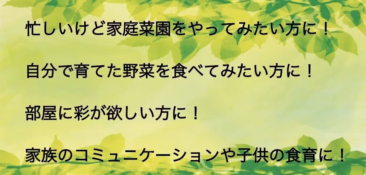 用意したお好きな種を土や農薬を使わず12個の専用植栽キットを入れるだけ!害虫発生や天候の心配なく、安心安全な野菜を年間通じていつでも楽しめます。