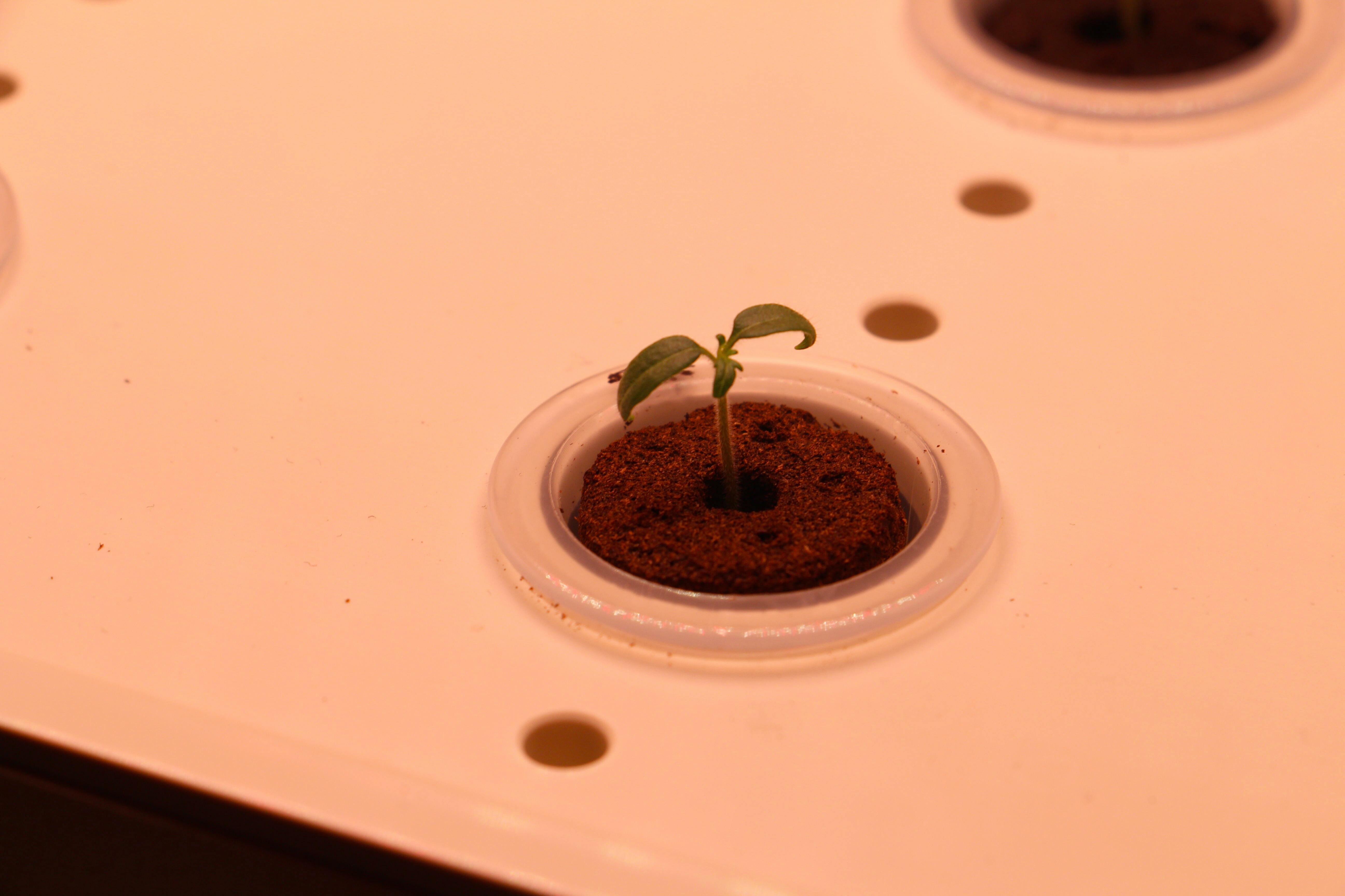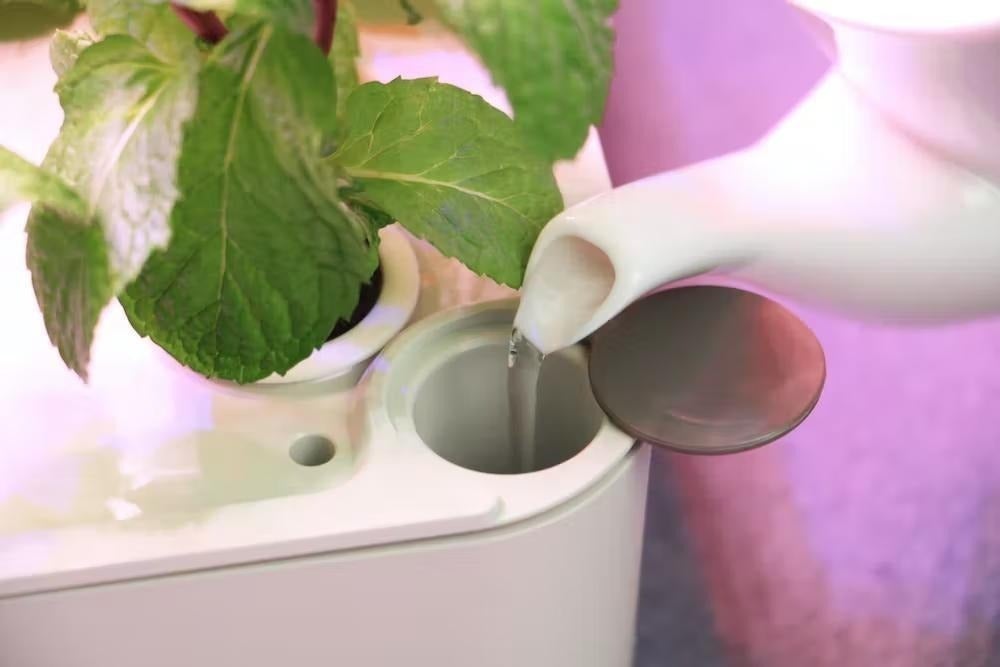 F:苗が発芽してから約20日後にプランター内の水を交換し、プラスチックの植栽カップを取り外します。4L目盛りまで水を再度追加し、*養液をゆっくりと追加します。(*養液は市販のものをご使用頂けます。)