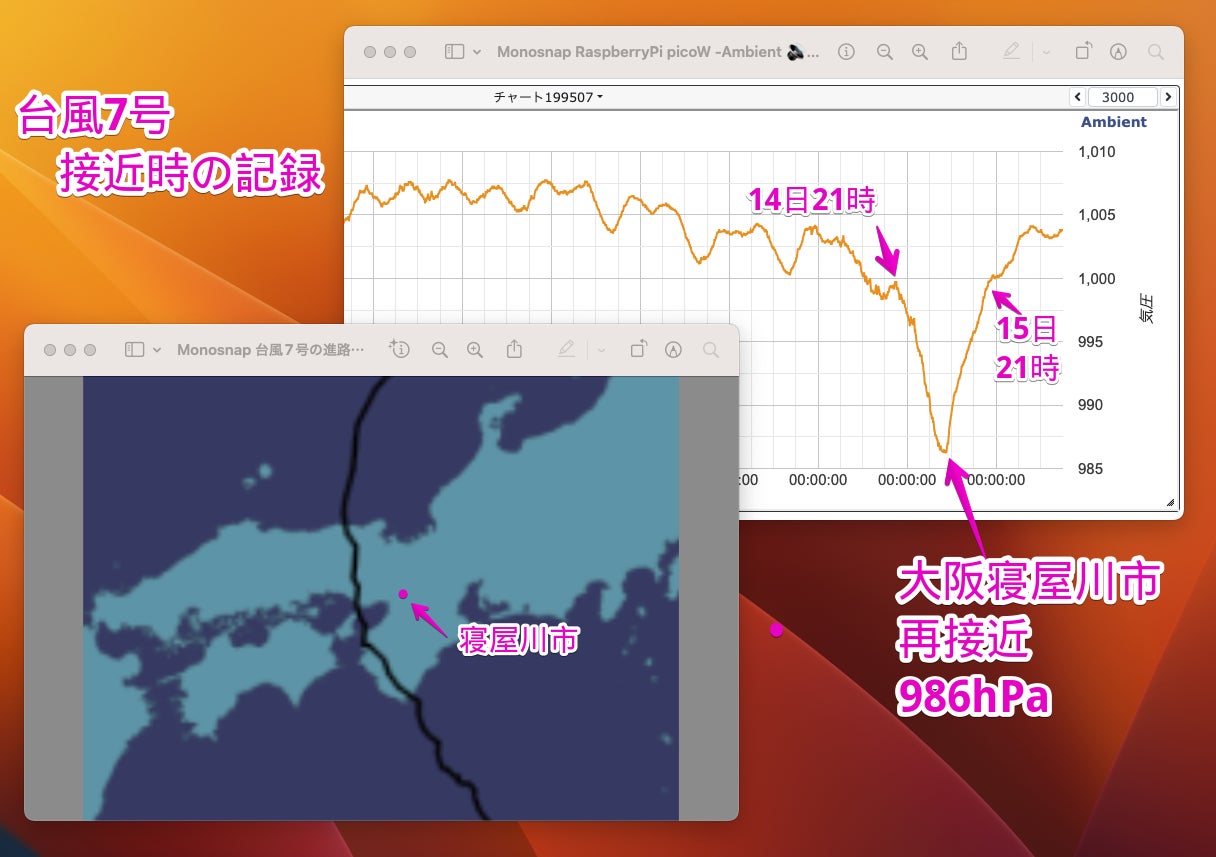 当地、大阪寝屋川市の台風7号接近時の気圧の記録です。