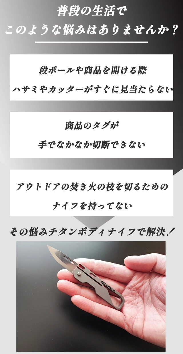 「持ち運びやすくで切れ味がいいミニナイフが欲しい」「チタンボディでカッコイイデザインのナイフがほしい」というニーズを捉え、今回のプロジェクトを立ち上げました。