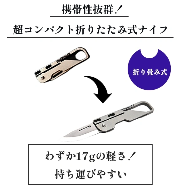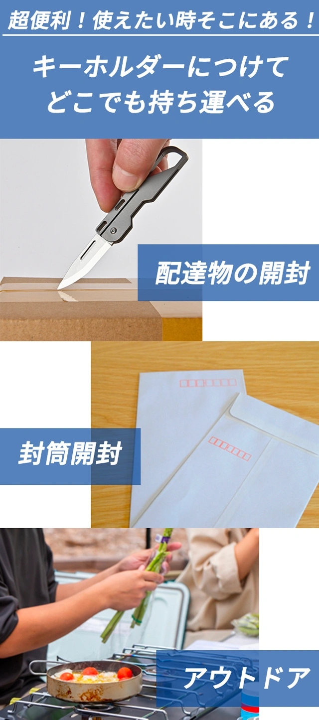 A:わずか17gの折りたたみ式ミニナイフです。段ボールの開封や紐のカットなど、日常のちょっとした瞬間はもちろん、キャンプやBBQといったアウトドアから災害時まで、幅広いシーンで活躍します。