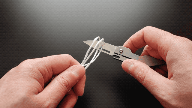 千切れづらくてイライラするヒモも、手首を少しひねるだけで切れます。